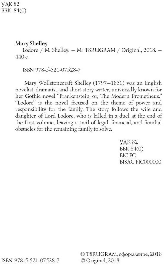 💳 Оплатить за товар можно при получении 🇰🇿 Есть бесплатная доставка по Казахстану 🎁 Копите бонусы с каждой покупки Серия: Original Mary Wollstonecraft Shelley (1797-1851) was an English novelist, dramatist, and short story writer, universally known for her Gothic novel «Frankenstein: or, The Modern Prometheus». «Lodore» is the novel focused on the theme of power and responsibility for the family. The story follows the wife and daughter of Lord Lodore, who is killed in a duel at the end of the first volume, leaving a trail of legal, financial, and familial obstacles for the remaining family to solve. |