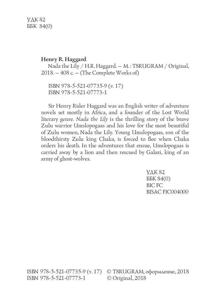 💳 Оплатить за товар можно при получении 🇰🇿 Есть бесплатная доставка по Казахстану от 1 дня 🎁 Копите бонусы с каждой покупки Серия: The Complete Works of Sir Henry Rider Haggard was an English writer of adventure novels set mostly in Africa, and a founder of the Lost World literary genre. Nada the Lily is the thrilling story of the brave Zulu warrior Umslopogaas and his love for the most beautiful of Zulu women, Nada the Lily. Young Umslopogaas, son of the bloodthirsty Zulu king Chaka, is forced to flee when Chaka orders his death. In the adventures that ensue, Umslopogaas is carried away by a lion and then rescued by Galazi, king of an army of ghost-wolves. |