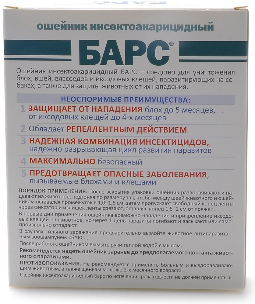 Способ применения: после вскрытия упаковки ошейник разворачивают и надевают на животное, подгоняя по размеру так, чтобы между шеей животного и ошейником оставался промежуток в 1,0–1,5 см, затем пропускают свободный конец ленты через фиксатор и излишек ошейника срезают. Непрерывное использование инсектоакарицидного ошейника «Барс» обеспечивает защиту собак и кошек от блох, вшей, волосовиков не менее 5 месяцев, от иксодовых клещей не менее 4 месяцев.