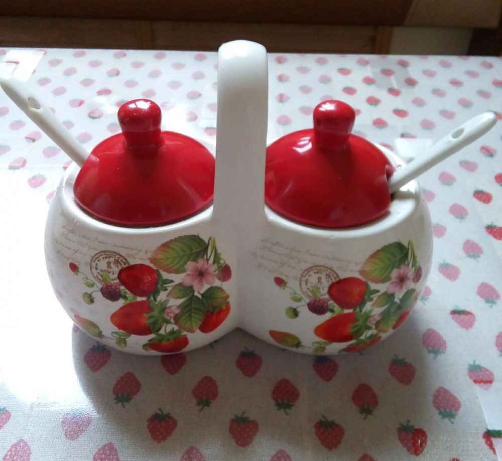 Универсальная двойная банка. Очередное приобретение из серии "Клубника". Использую для растворимого кофе и сахара. Немного неустойчивы крышки, но решила проблему приклеив прозрачный двухсторонний скотч.