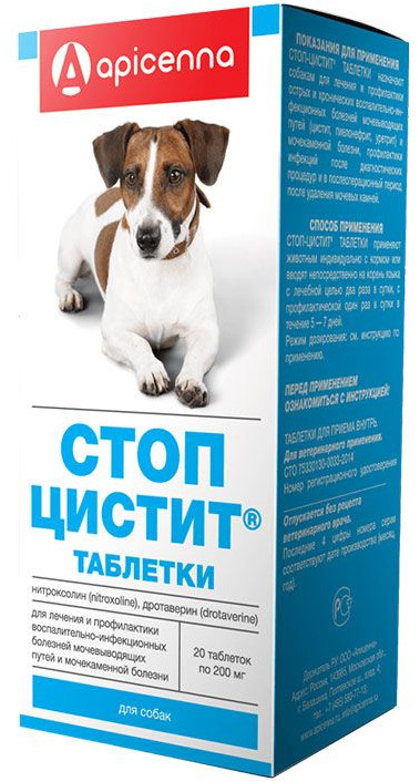Состав и форма выпуска: «Стоп-цистит» — комплексный препарат для лечения и профилактики урологических заболеваний у собак в форме таблеток для применения внутрь. В 1 таблетке содержится: 25 мг нитроксолина, 30 мг дротаверина гидрохлорида, 10 мг экстракта плодов можжевельника, 10 мг экстракта травы горца птичьего, 10 мг экстракта листьев крапивы, 10 мг экстракта корня солодки, 10 мг экстракта листьев брусники,10 мг экстракта березовых листьев, а также вспомогательные компоненты. По внешнему виду препарат представляет собой таблетки массой 200 мг для применения внутрь. Расфасовывают по 20 таблеток в полимерные банки, упакованные в картонные коробки.