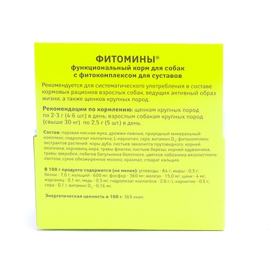 При покупке особо не верила, что поможет. За свою цену достойные витамины. У чихуашки были проблемы с коленным суставом, на ногу не наступала. Ветеринар советовал операцию. К нашей радости проблема решилась. Пропиваем теперь курсами весной и осенью. С ногами проблем нет! Спасибо!
