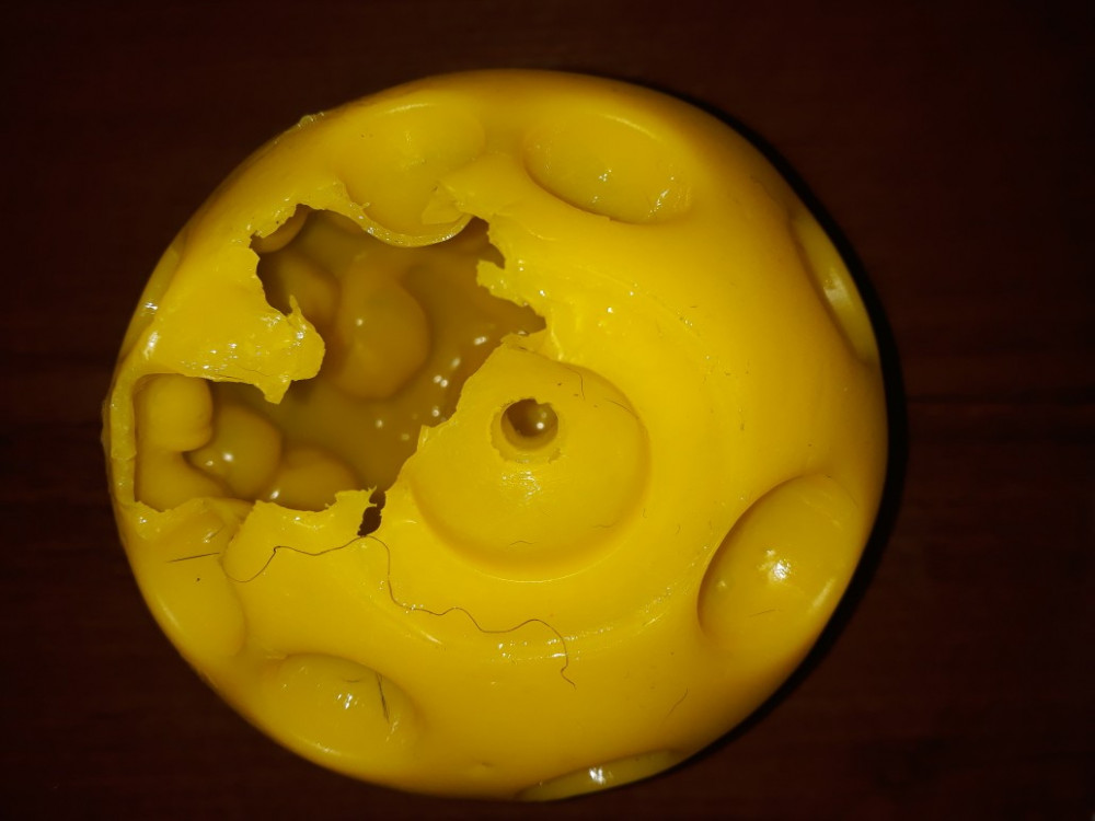 Отличный мячик! Стоит своих денег. Моя немецкая овчарка до сих пор не разгрызла, прошла почти неделя) Единственный минус - очень громкий звук, пищалку пришлось вытащить.