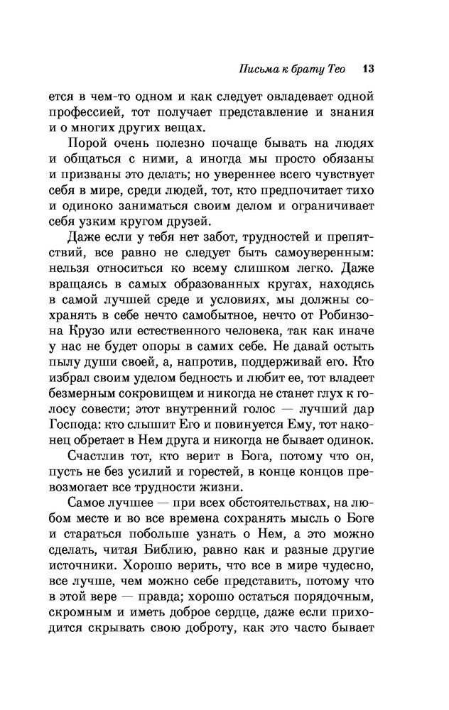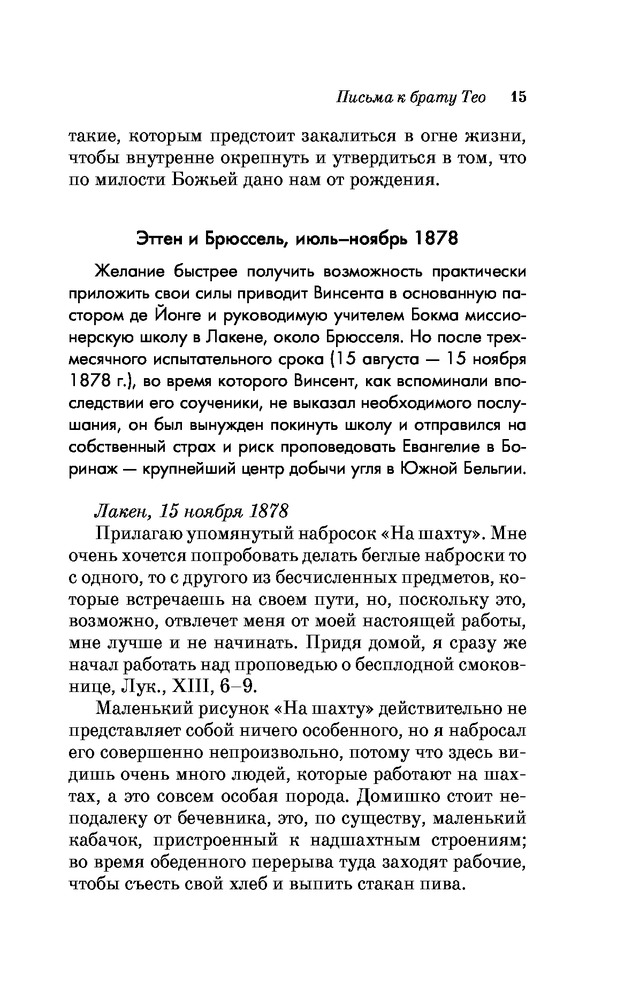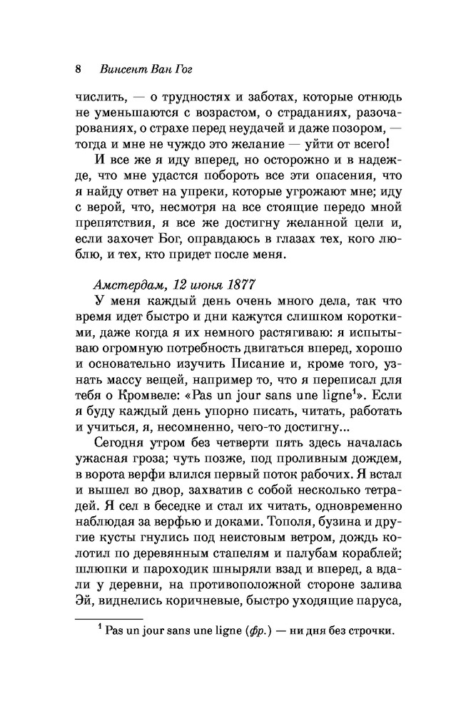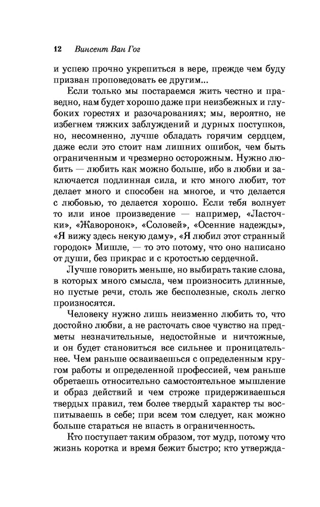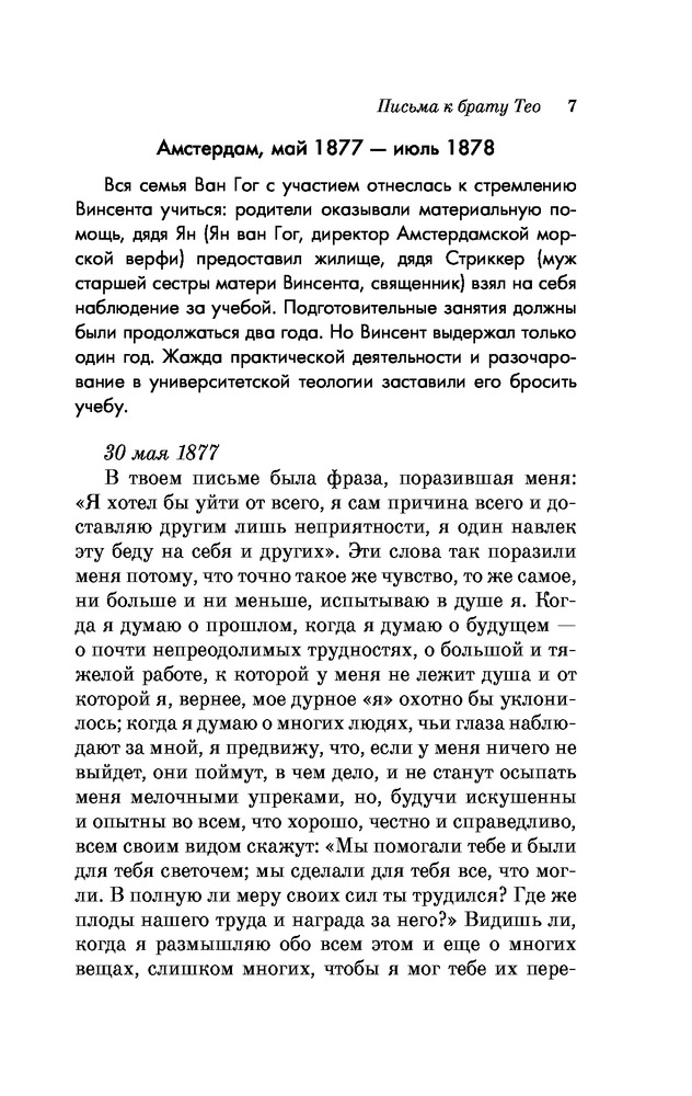 Книга делится на два периода: Голландский и Французский и кроме писем, есть небольшие аннотации по биографии. Ван Гог дает объяснением своим картинам, рассуждает о состоянии искусства, о работе с цветом, но книга будет интересна не только поклонникам живописи - она столь же биографична, сколь в бОльшем ее смысле философична. Меня удивило в его характере то, что не смотря на грустный взгляд в его автопортретах, по сути он оказался человеком страстным, неистовым, оптимистичным (не смотря на все трудности, даже безумие, он вечно хранил в себе храбрость никогда не угасать и не сдаваться). По сути, это документальная книга, в которой собраны письма - предельно честные, откровенные и искренние письма - Ван Гога его брату Теодору, человеку, который был чуть ли не единственный, кто всегда поддерживал и верил в него. И благодаря этой искренности нам дается возможность ясно и глубоко раскрыть для себя этот гений, понять его, и самое главное - заглянуть, чем же жила душа того, кто всю жизнь посвятил лишь одному - служению искусства.