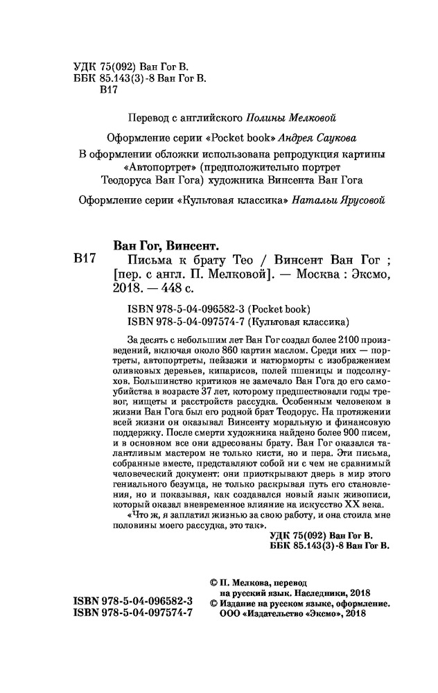 Письма к брату ТеоВ данный момент этот товар отсутствует в продаже. Возможно, у нас найдется аналогичный или похожий товар здесь. Серия: Pocket Book (обложка) За десять с небольшим лет Ван Гог создал более 2100 произведений, включая около 860 картин маслом. Среди них — портреты, автопортреты, пейзажи и натюрморты, с изображением оливковых деревьев, кипарисов, полей пшеницы и подсолнухов. Большинство критиков не замечало Ван Гога до его самоубийства в возрасте 37 лет, которому предшествовали годы тревог, нищеты и расстройств рассудка. Особенным человеком в жизни Ван Гога был его родной брат Теодорус. На протяжении всей жизни он оказывал Винсенту моральную и финансовую поддержку. После смерти художника найдено более 900 писем и в основном все они адресованы брату. Ван Гог оказался талантливым мастером не только кисти, но и пера. Эти письма, собранные вместе, представляют собой ни с чем не сравнимый человеческий документ: они приоткрывают дверь в мир этого гениального безумца, раскрывая не только путь его становления, но и показывая, как создавался новый язык живописи, который оказал вневременное влияние на искусство XX века.«Что ж, я заплатил жизнью за свою работу, и она стоила мне половины моего рассудка, это так». |