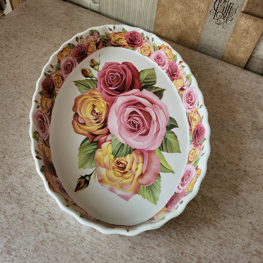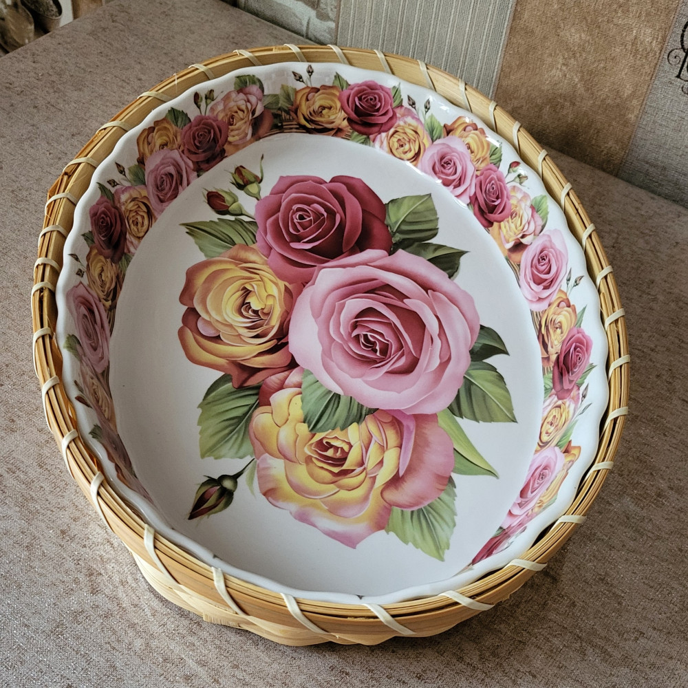 Цвет формы очень бледный,цветы блеклые,форма овальная,форма очень громоздкая,шероховатая,неприятная на ощупь.В духовке в такой запекать точно не стоит.Подставка из какой-то дешевой соломы.Все-таки оставила,буду использовать для оформления холодных блюд
