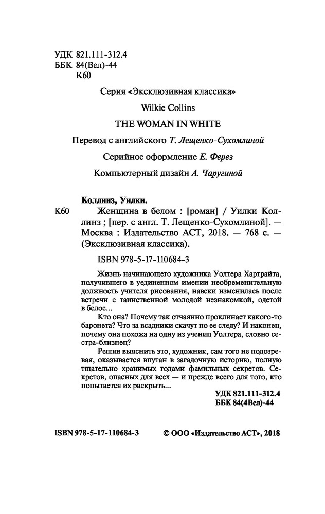 💳 Оплатить за товар можно при получении 🇰🇿 Есть бесплатная доставка по Казахстану от 1 дня 🎁 Копите бонусы с каждой покупки Серия: Эксклюзивная классика Жизнь начинающего художника Уолтера Хартрайта, получившего в уединенном имении необременительную должность учителя рисования, навеки изменилась после встречи с таинственной молодой незнакомкой, одетой в белое... |