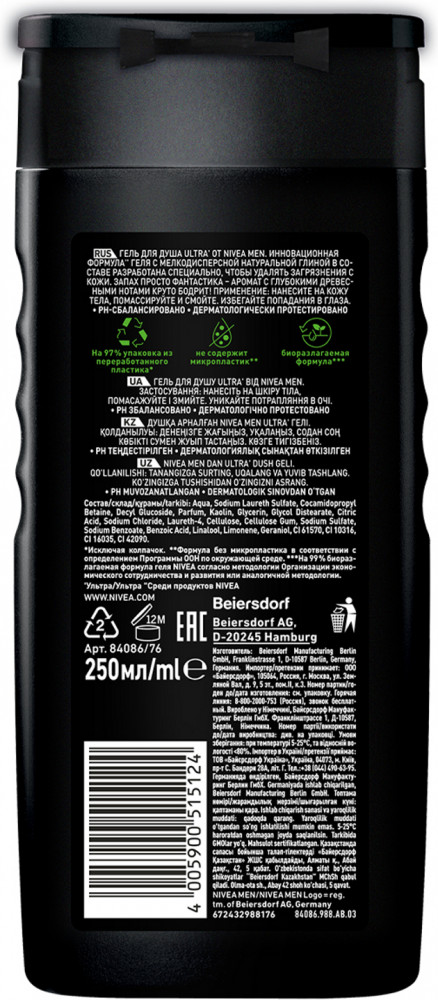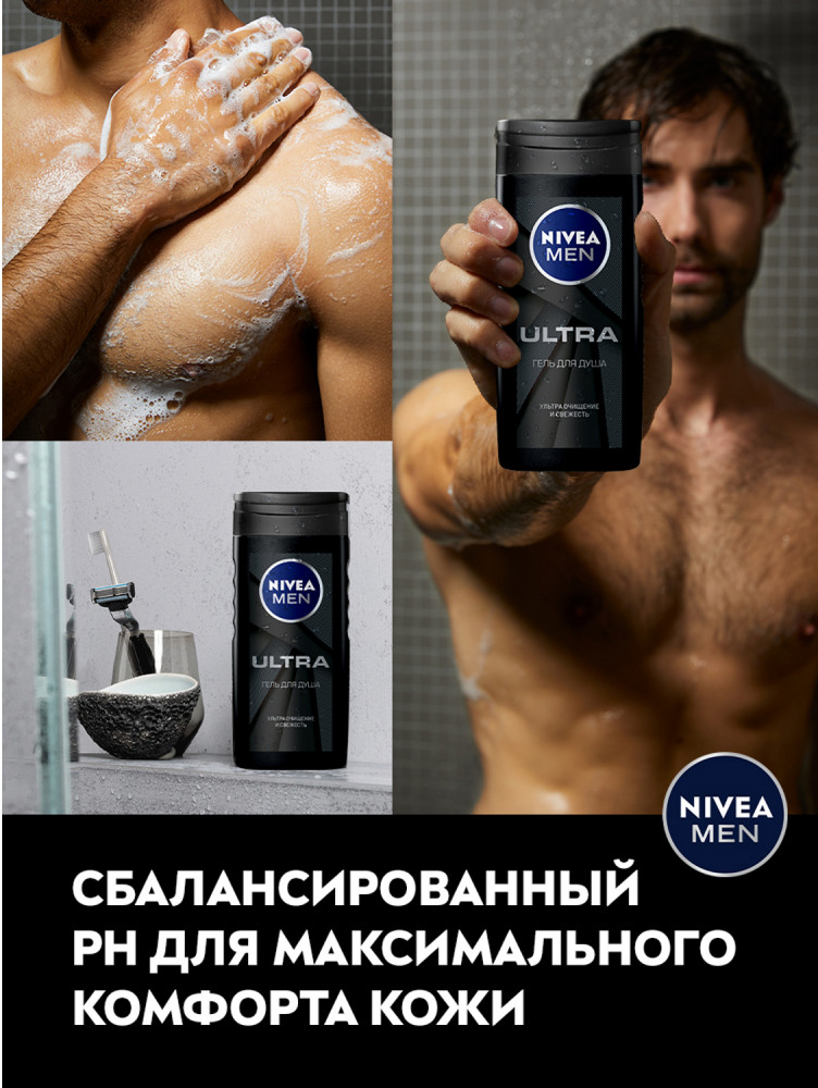 NIVEA Гель для душа мужской «Ultra» с натуральной глиной, 250 мл-20% +45 приятный запах плотная пена густая консистенция хорошо смывается