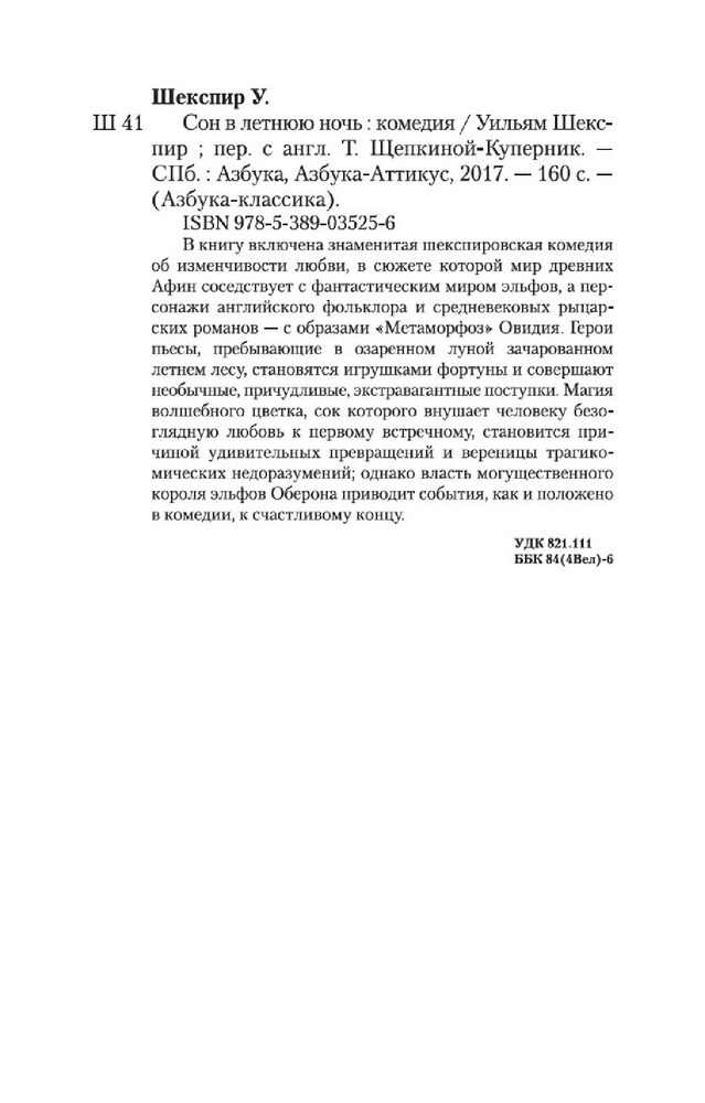 Сама книга прекрасного качества. Но история и сюжет, при всей моей любви в греческим мифам и фэнтези–не понравилась. Не было никакого трепета и хорошего впечатления. К героям не привязалась. Думаю повествование Шекспира не в моем вкусе. По качеству-ВСЕ 5!