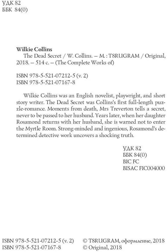 💳 Оплатить за товар можно при получении 🇰🇿 Есть бесплатная доставка по Казахстану от 1 дня 🎁 Копите бонусы с каждой покупки Серия: The Complete Works of Wilkie Collins was an English novelist, playwright, and short story writer. The Dead Secret was Collins’s first full-length puzzle-romance. Moments from death, Mrs Treverton tells a secret, never to be passed to her husband. Years later, when her daughter Rosamond returns with her husband, she is warned not to enter the Myrtle Room. Strong-minded and ingenious, Rosamond’s determined detective work uncovers a shocking truth. |