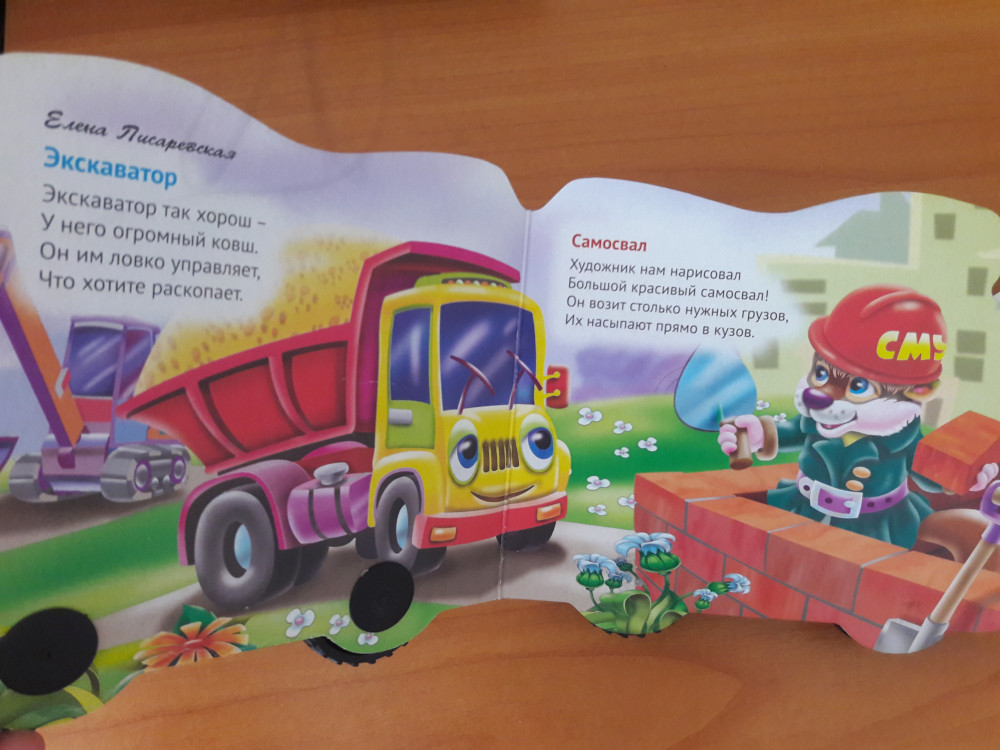 Хорошая книжка с колесиками, все крепко держится. Стишки интересные. Ставлю на одну звезду меньше, потому-что сейчас скидка хорошая, а я купила за полную сумму