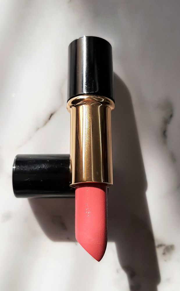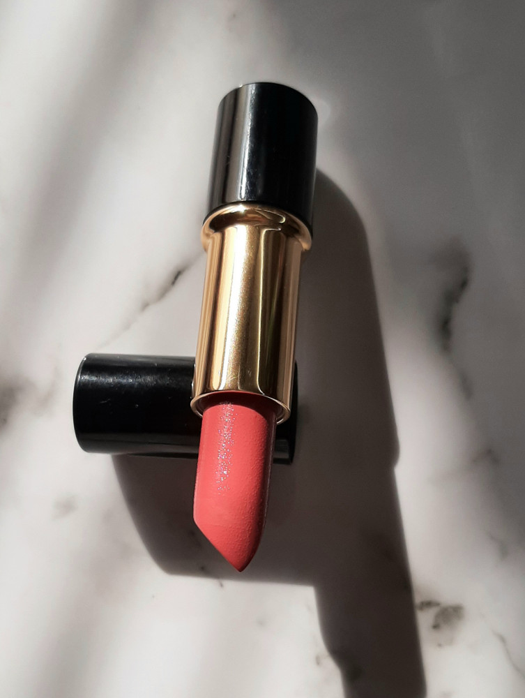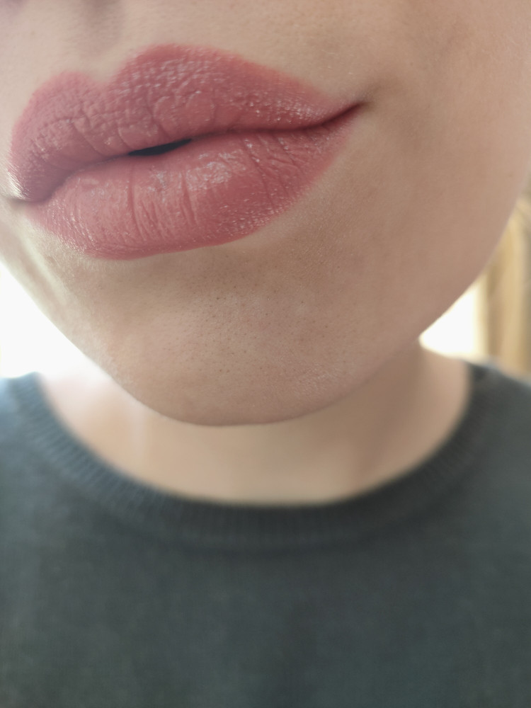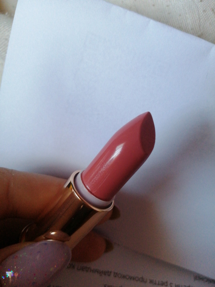 Тон 371, на сайте кажется ближе к коричневому, в жизни же более розовая, не то что я хотела. Текстура мягкая, запах приятный, без шиммера, выглядит на губах хорошо, но может придавать желтизны зубам из-за теплого подтона.