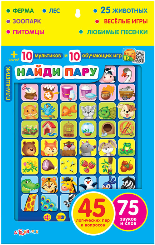 Азбукварик Планшет «Найди пару»В данный момент этот товар отсутствует в продаже. Возможно, у нас найдется аналогичный или похожий товар здесь. Серия: Планшетик «Азбукварик» представляет новый обучающий планшетик для малышей с веселыми логическими играми «Найди пару» и «Чей это голос?». Знакомься с животными фермы, леса и зоопарка, угадывай их голоса! Ты узнаешь, что они едят, где живут и какую пользу приносят. Подбери пару к каждому животному. |
