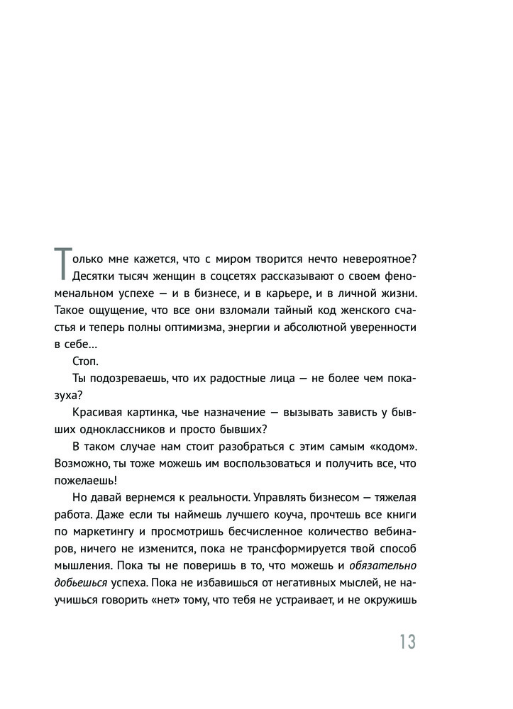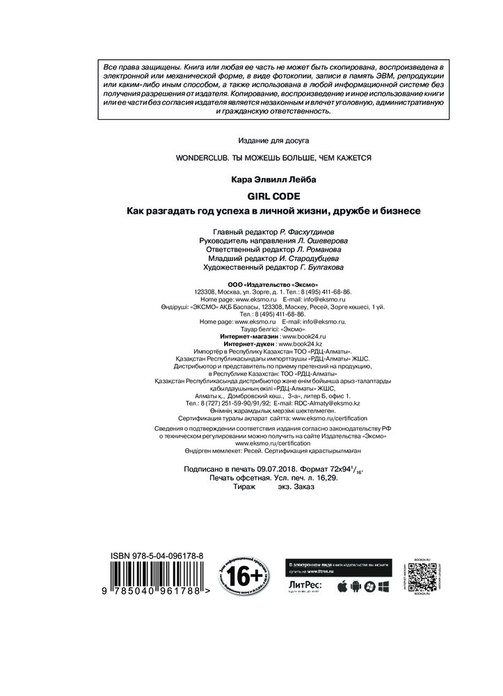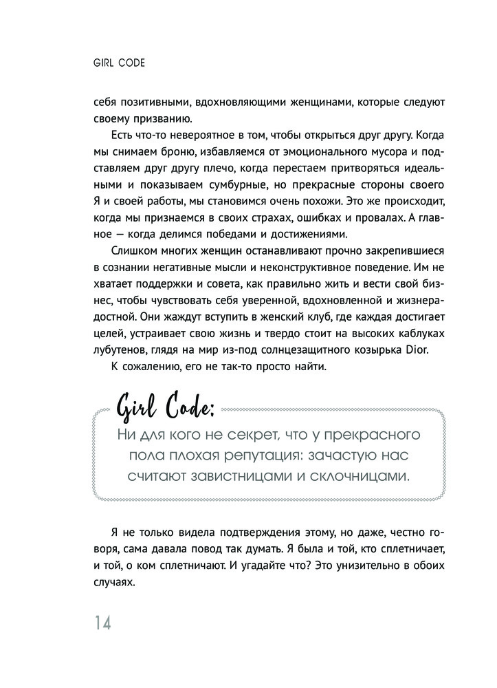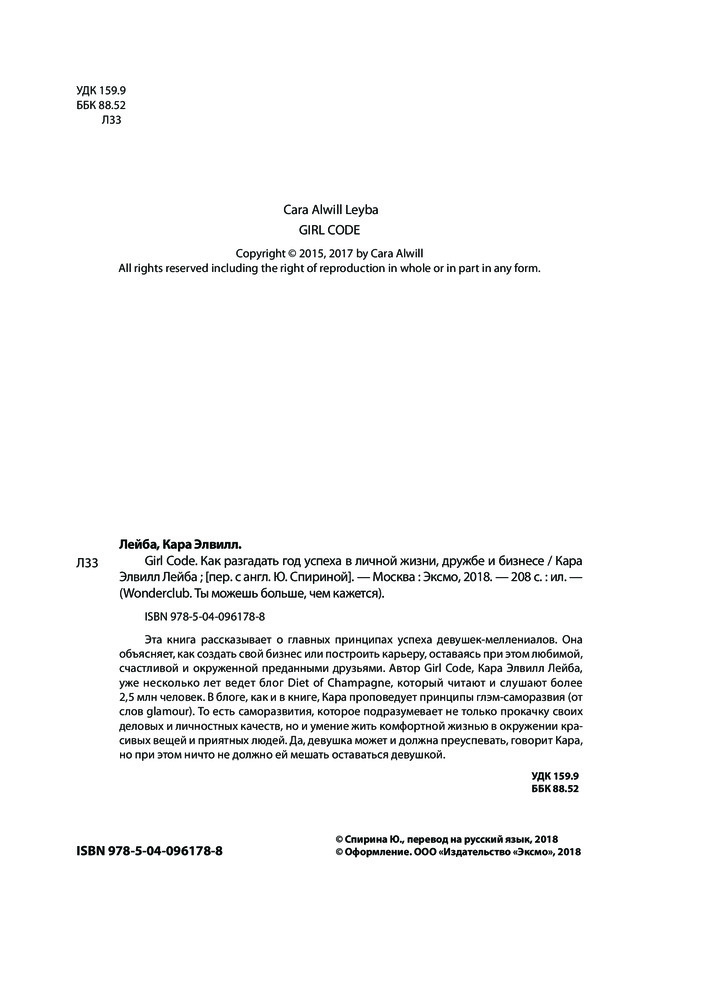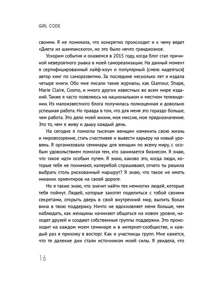Girl Code. Как разгадать код успеха в личной жизни, дружбе и бизнесеВ данный момент этот товар отсутствует в продаже. Возможно, у нас найдется аналогичный или похожий товар здесь. Серия: Wonderclub. Ты можешь больше, чем кажется Эта книга рассказывает о главных принципах успеха девушек-меллениалов. Она объясняет, как создать свой бизнес или построить карьеру, оставаясь при этом любимой, счастливой и окруженной преданными друзьями. Автор Girl Code, Кара Элвилл Лейба, уже несколько лет ведет блог Diet of Champagne, который читают и слушают более 2 с половиной миллионов человек. В блоге, как и в книге, Кара проповедует принципы глэм-саморазвия (от слов glamour). То есть саморазвития, которое подразумевает не только прокачку своих деловых и личностных качеств, но и умение жить комфортной жизнью в окружении красивых вещей и приятных людей. Да, девушка может и должна преуспевать, говорит Кара, но при этом ничто не должно ей мешать оставаться девушкой. |