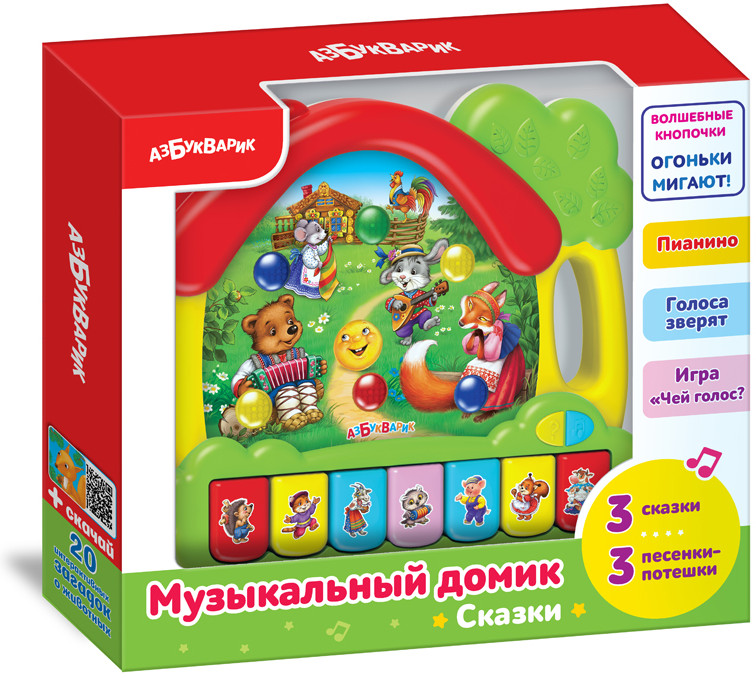 Азбукварик Игрушка «Сказки»В данный момент этот товар отсутствует в продаже. Возможно, у нас найдется аналогичный или похожий товар здесь. Музыкальная игрушка в форме домика с 2-мя режимами: «Песенки, сказки, пианино» и "Звуки". |