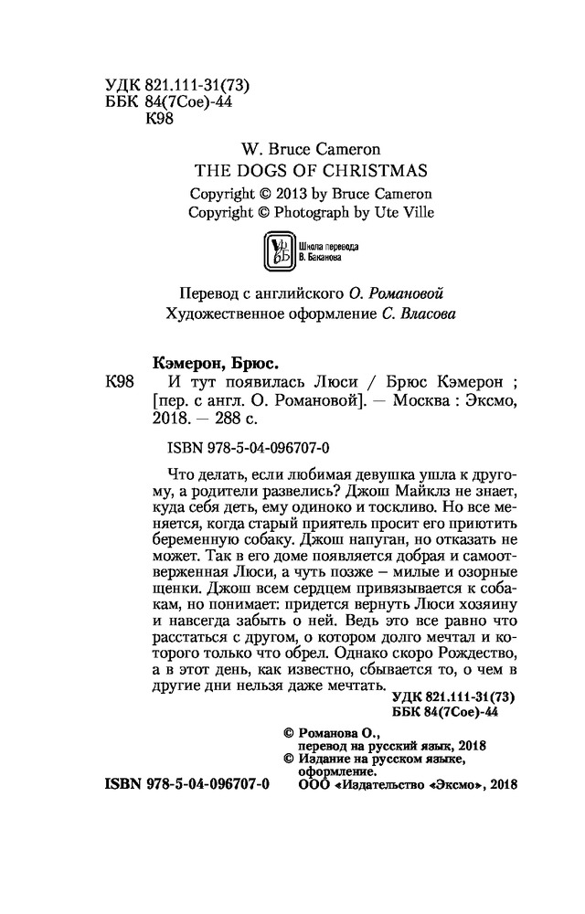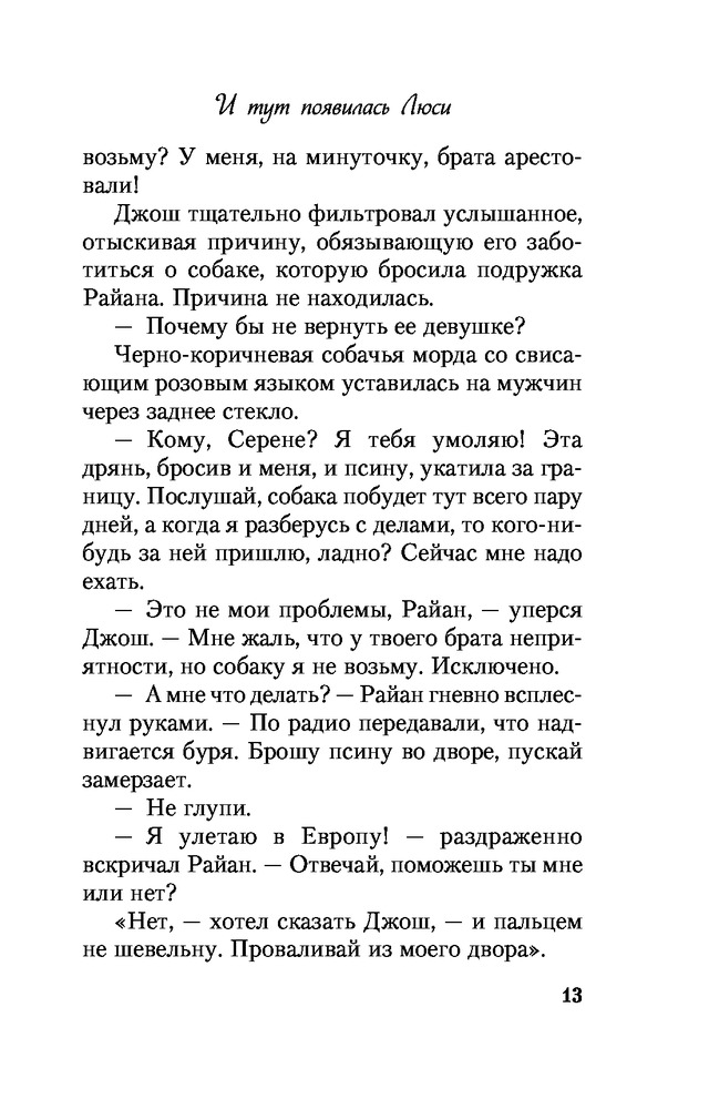 И тут появилась ЛюсиВ данный момент этот товар отсутствует в продаже. Возможно, у нас найдется аналогичный или похожий товар здесь. Серия: Тот, кто не предаст. Люди и их питомцы (обложка) Что делать, если любимая девушка ушла к другому, а родители развелись? Джош Майклз не знает, куда себя деть, ему одиноко и тоскливо. Но все меняется, когда старый приятель просит его приютить беременную собаку. Джош напуган, но отказать не может. Так в его доме появляется добрая и самоотверженная Люси, а чуть позже — милые и озорные щенки. Джош всем сердцем привязывается к собакам, но понимает: придется вернуть Люси хозяину и навсегда забыть о ней. Ведь это все равно, что расстаться с другом, о котором долго мечтал и которого только что обрел. Однако скоро Рождество, а в этот день, как известно, сбывается то, о чем в другие дни нельзя даже мечтать. |