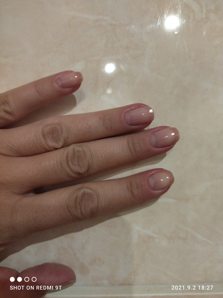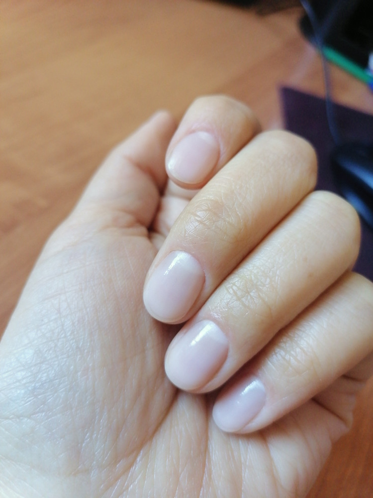 Сразу после нанесения на ногти понравился их внешний вид: гладкие,с лёгким розовым оттенком. Высохли слои (два) быстро. Но вот на следующий день гладкости такой и глянца уже не было и вид, как будто неделю относила и при нанесении не дала нормально просохнуть.