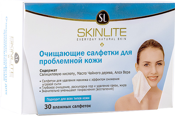 Очищающие влажные салфетки «Skinlite» для проблемной кожи бережно очищают вашу кожу, удаляя макияж, пыль, жир, пот и грязь. Салфетки содержат салициловую кислоту, масло чайного дерева, Алоэ Вера.