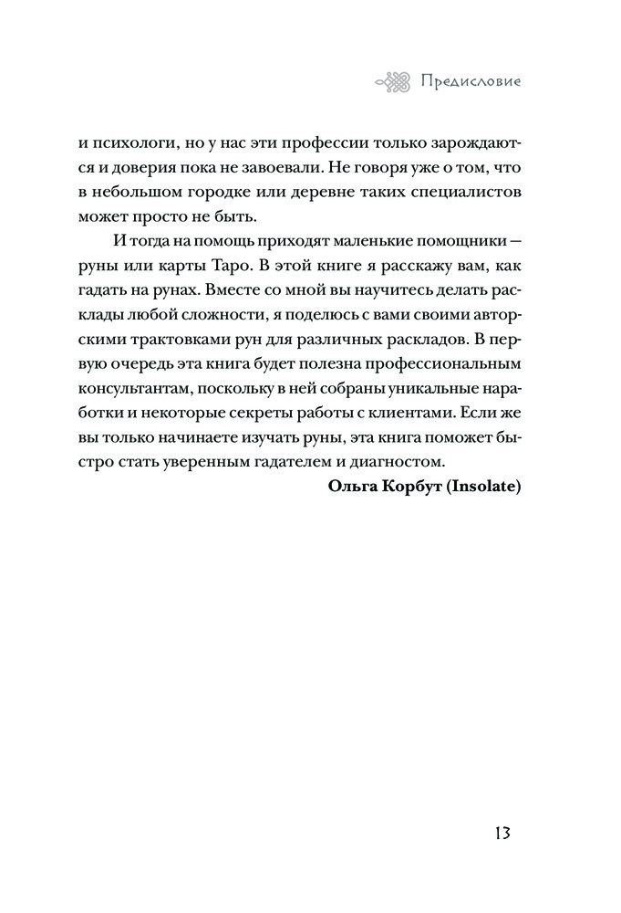 Приобрела себе данную книгу, так как собираю все книги Ольги Корбут. Очень ценная книга! очень много информации, все разложено по полочкам, очень структурированно. Книга шикарная! тем, кто занимается рунами, пусть то новички, либо давно практикующие рунологи - советую однозначно! шикарная книга! Очень много простых и очень сложных вариантов раскладов, с трактовкой и вариантами. Повторюсь: книга шикарная! Огромный объем знаний собран в одном месте