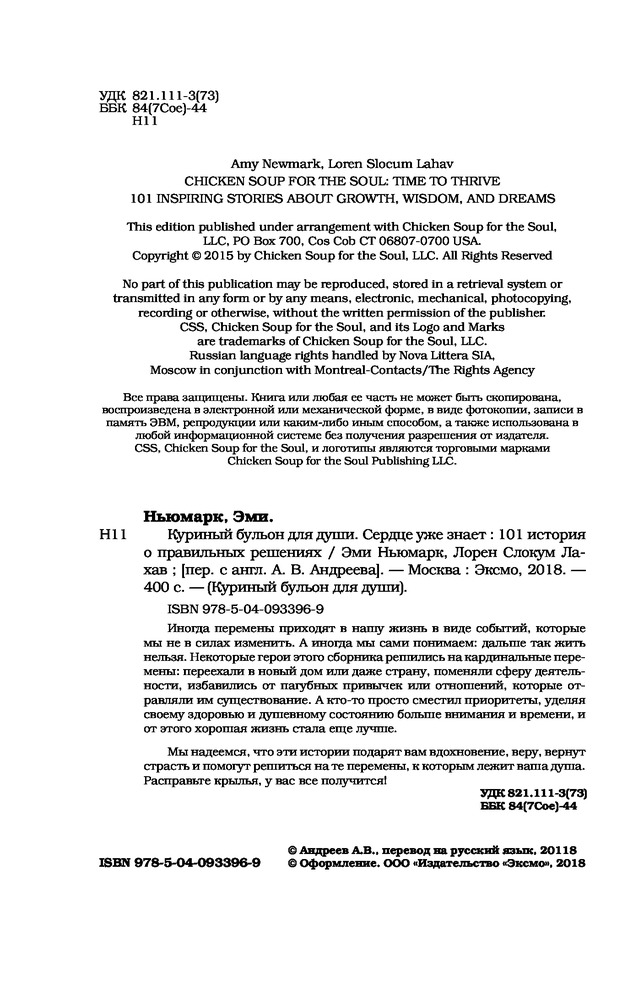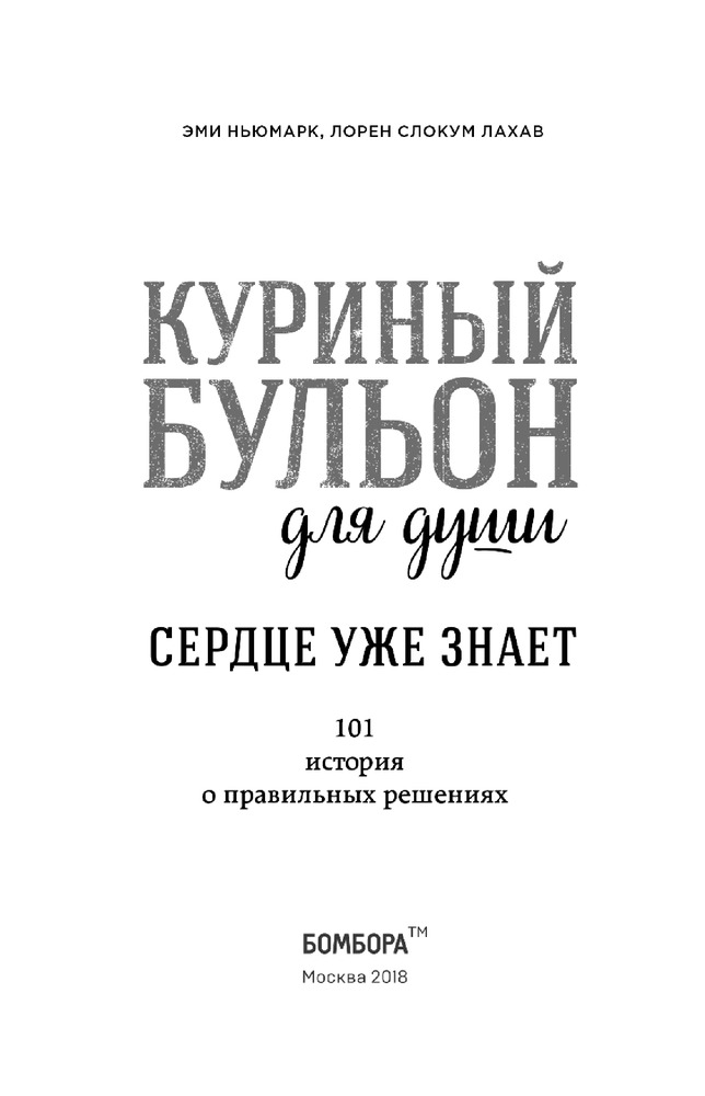 Куриный бульон для души. Сердце уже знает. 101 история о правильных решенияхЭми Ньюмарк, Лорен Слокум Лахав В данный момент этот товар отсутствует в продаже. Возможно, у нас найдется аналогичный или похожий товар здесь. Серия: Куриный бульон для души Иногда перемены приходят в нашу жизнь в виде событий, которые мы не в силах изменить. А иногда мы сами понимаем: дальше так жить нельзя. Некоторые герои этого сборника решились на кардинальные перемены: переехали в новый дом или даже страну, поменяли сферу деятельности, избавились от пагубных привычек или отношений, которые отравляли им существование. А кто-то просто сместил приоритеты, уделяя своему здоровью и душевному состоянию больше внимания и времени, и от этого хорошая жизнь стала еще лучше. |