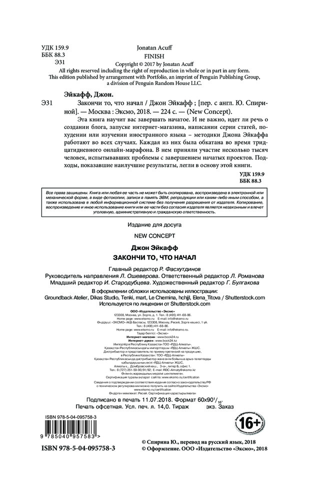💳 Оплатить за товар можно при получении 🇰🇿 Есть бесплатная доставка по Казахстану от 1 дня 🎁 Копите бонусы с каждой покупки Серия: New Concept Мир принадлежит тем, кто умеет завершать начатые проекты. Если учесть, сколько отвлекающих факторов содержит современная реальность, то таких людей с каждым днем становится все меньше и меньше. Мы не выполняем данные себе же обещания, бросаем на половину прочитанные книги, перестаем посещать спортзал и никогда не переходим от создания планов к их реализации. Поэтому книга Джона Эйкаффа актуальна как никогда. Она предлагает систему приемов, которые блокируют попытки «подвесить» начатое дело. Эти приемы были проверены на тысячах подписчиков блога Эйкаффа во время тридцатидневного онлайн-марафона. Методика, изложенная в этой книге, помогла огромному числу людей поверить в свои силы, ощутить прилив вдохновение и закончить то, что было начато. |