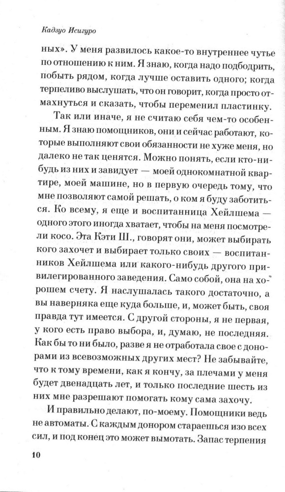 Прекрасная книга. Да, не экшн, не детектив. Книга для тех, кто задумывается над извечными вопросами - есть ли душа у тех, кто отказывает в ее существовании у других. Простое, вроде бы, повествование, но вызывающее такой страх перед будущим человечества - неужели мы способны на такое?! И тут же поражаешься искренности героям, которые ЭТО воспринимают как должное, даже не задумываясь о чудовищности того, что с ними происходит. (Специально не раскрываю сюжета - это нечто)