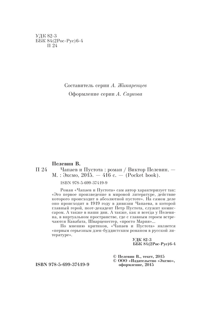 Чапаев и ПустотаВ данный момент этот товар отсутствует в продаже. Возможно, у нас найдется аналогичный или похожий товар здесь. Серия: Pocket Book (обложка) Роман "Чапаев и Пустота" сам автор характеризует так: "Это первое произведение в мировой литературе, действие которого происходит в абсолютной пустоте". На самом деле оно происходит в 1919 году в дивизии Чапаева, в которой главный герои, поэт-декадент Петр Пустота, служит комиссаром. А также в наши дни. А также, как и всегда у Пелевина, в виртуальном пространстве, где с главным героем встречаются Кавабата, Шварценеггер, "просто Мария"… |