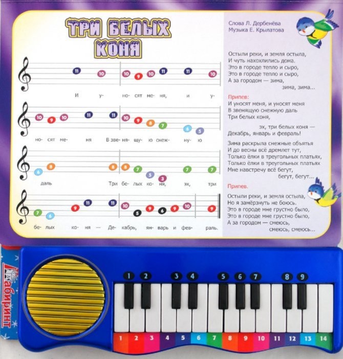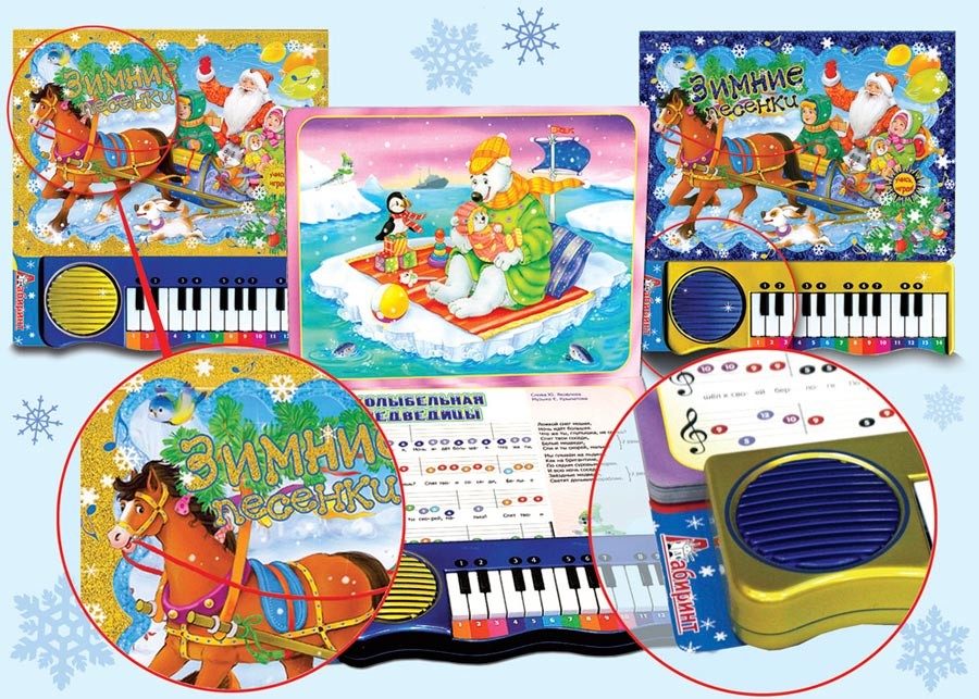 Зимние песенки + пианиноДербенев Л.П., Зинаида Николаевна Александрова В данный момент этот товар отсутствует в продаже. Возможно, у нас найдется аналогичный или похожий товар здесь. Серия: Новый год Прекрасный подарок к Новому году! С детским пианино "Зимние песенки" ребенок сможет сыграть и спеть десять известных и всеми любимых песен о зиме и Новом годе - "В лесу родилась елочка", "Расскажи, снегурочка, где была…", "Маленькой елочке холодно зимой…", "Почему медведь зимой спит?", "Три белых коня", "Елочка", "Кабы не было зимы…", "Колыбельная медведицы", "Зима" - а также знаменитую новогоднюю песню "Jingle Bells". Вы найдете книжку-пианино на любой вкус, ведь "Зимние песенки" существуют в разных вариантах оформления: традиционные новогодние красный и зелёный цвета, а также нарядные сочетания золотого и синего цветов. Книги из плотного картона с пианино, прикрепленным снизу (горизонтальное расположение; пианино работает от пальчиковых батареек), удобная запись нот, замечательные праздничные иллюстрации. Для детей 5-10 лет. |