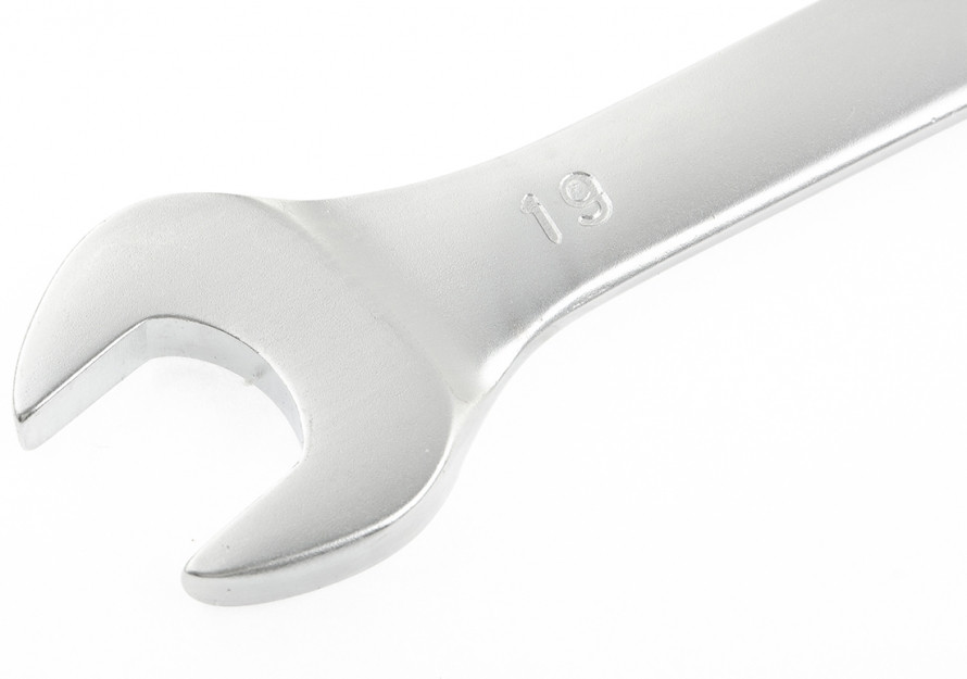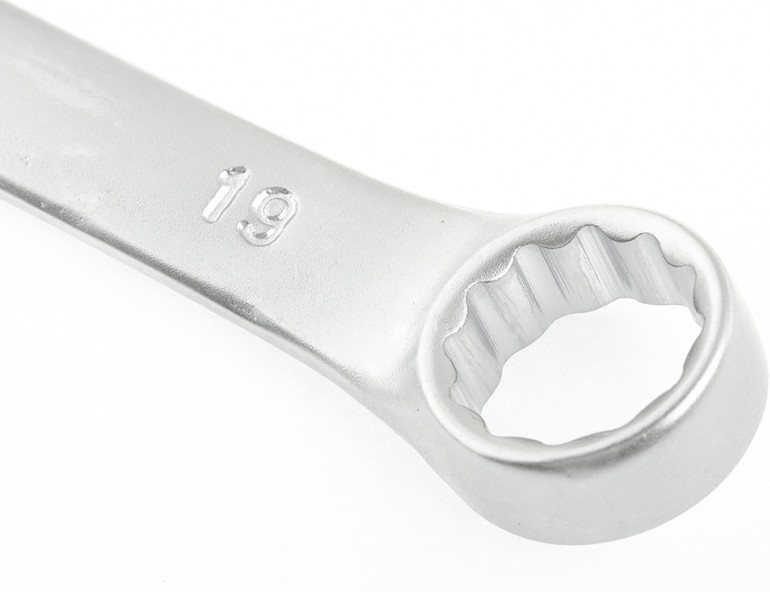 Ключ из хромованадиевой стали с матовым хромоникелевым покрытием. Твердость материала рабочей части — 45 HRc. Профиль кольцевого зева имеет 12 граней, что увеличивает площадь соприкосновения рабочих поверхностей и снижает риск деформации граней крепежа при монтаже. Угол наклона кольцевого зева относительно плоскости ключа в 15 градусов делает монтаж более удобным. Ключ гаечный комбинированный, с открытым и кольцевым зевом предназначен для монтажа/демонтажа резьбовых соединений. |