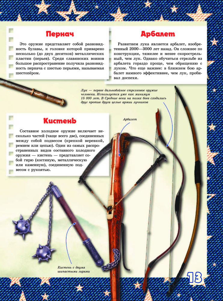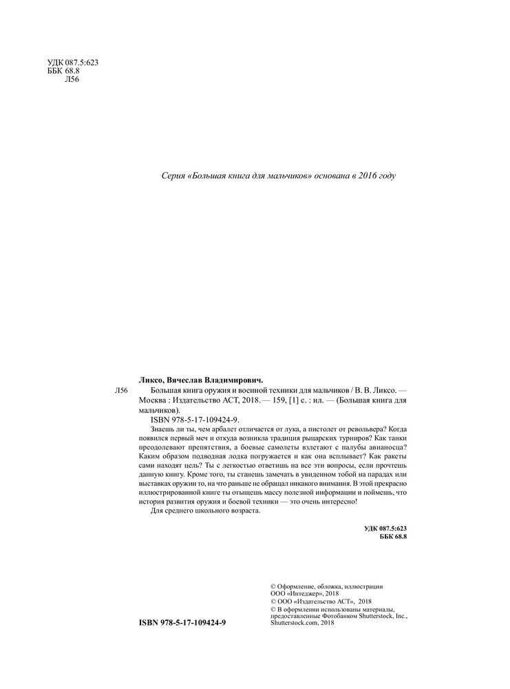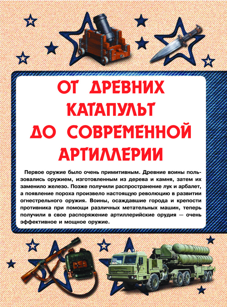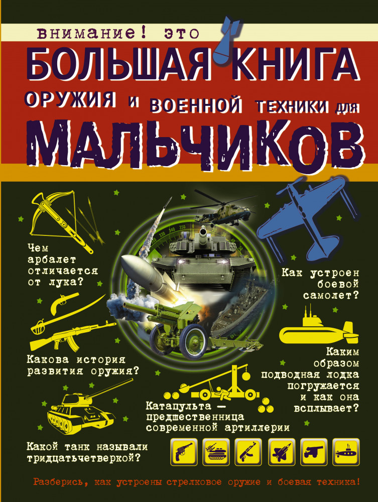 Большая книга оружия и военной техники для мальчиковВ данный момент этот товар отсутствует в продаже. Возможно, у нас найдется аналогичный или похожий товар здесь. Серия: Большая книга для мальчиков Знаешь ли ты, чем арбалет отличается от лука, а пистолет от револьвера? Когда появился первый меч и откуда возникла традиция рыцарских турниров? Как танки преодолевают препятствия, а боевые самолеты взлетают с палубы авианосца? Каким образом подводная лодка погружается и как она всплывает? Как ракеты сами находят цель? Ты с легкостью ответишь на все эти вопросы, если прочтешь данную книгу. Кроме того, ты станешь замечать в увиденном тобой на парадах или выставках оружии то, на что раньше не обращал никакого внимания. В этой прекрасно иллюстрированной книге ты отыщешь массу полезной информации и поймешь, что история развития оружия и боевой техники — это очень интересно! |