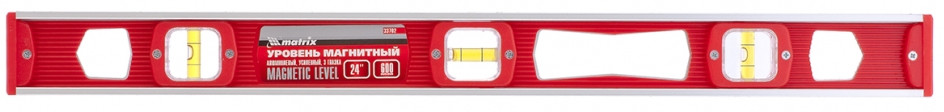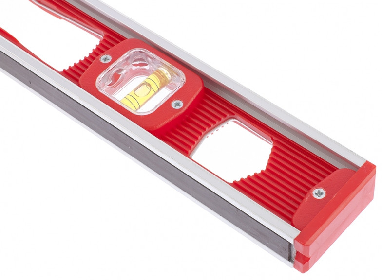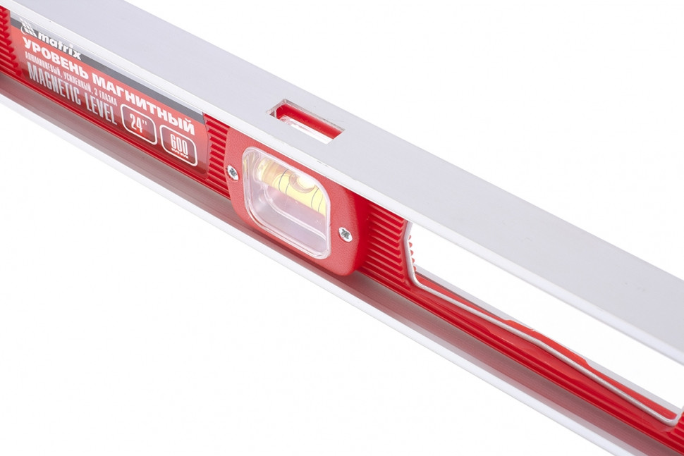 Корпус уровня изготовлен из ударопрочной пластмассы с алюминиевым каркасом. В корпус инструмента встроены магниты для фиксации на металлических поверхностях. Модель имеет три акриловых глазка для проверки отклонений по горизонтали и вертикали. Точность измерений – 1 мм м (0,057 градуса).