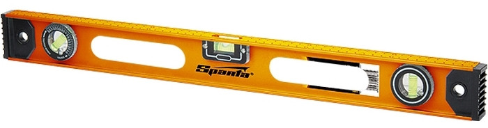 Уровень изготовлен из двутаврового алюминиевого профиля с анодированным покрытием. Имеет три пузырьковых глазка для проверки отклонений по горизонтали, вертикали, а также один из глазков является поворотным и позволяет использовать уровень для выставления произвольных углов. Точность – 1 мм м (0,057 градуса).