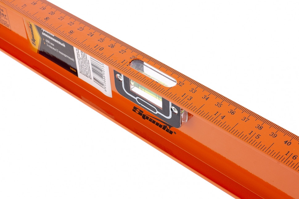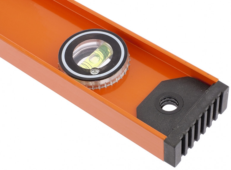 Уровень изготовлен из двутаврового алюминиевого профиля с анодированным покрытием. Имеет три пузырьковых глазка для проверки отклонений по горизонтали, вертикали, а также один из глазков является поворотным и позволяет использовать уровень для выставления произвольных углов. Точность – 1 мм м (0,057 градуса).