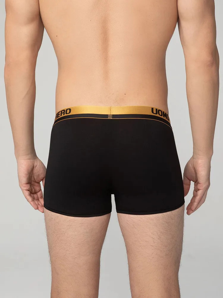 Мужские трусы. Выполнены из трикотажного хлопкового полотна, приятного к телу, с золотистой резинкой и логотипом черного цвета.