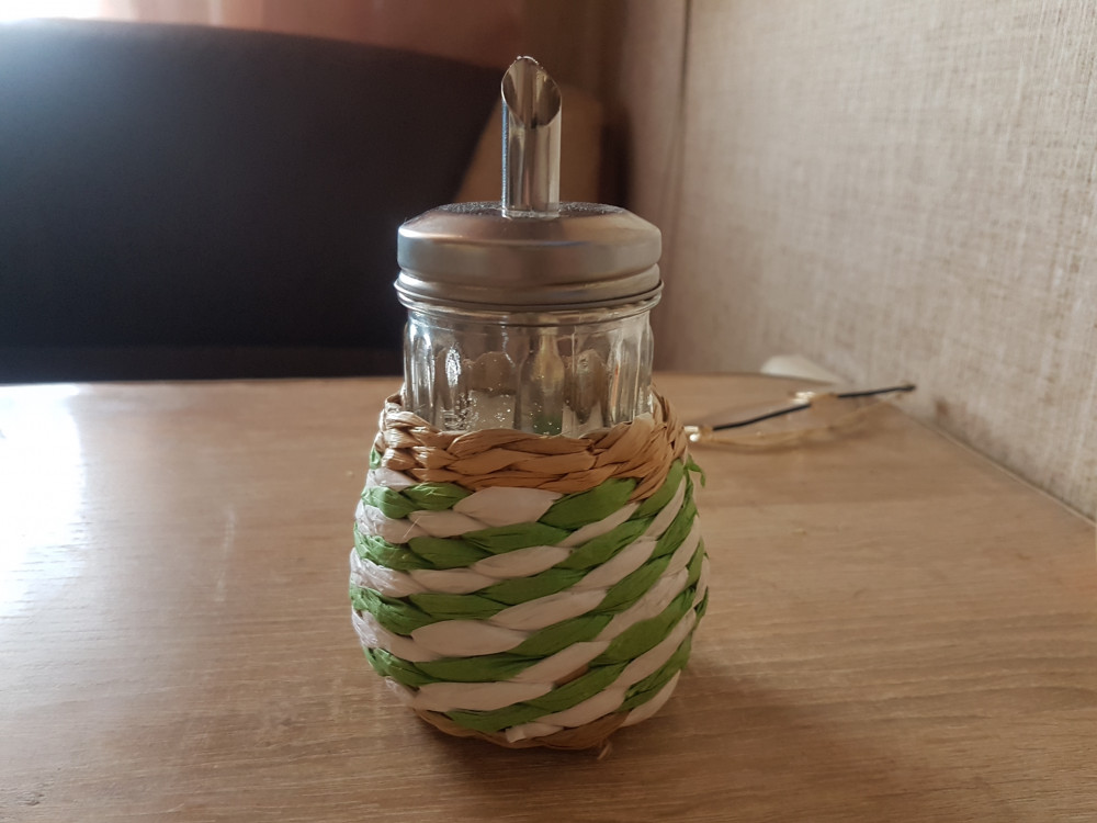 Плетенка не из ивы, а местами из бумаги, причем красной. Сняла эту бежево-красную плетенку (легко снимается, никаких следов нет на стекле после снятия) и использую просто стеклянную.