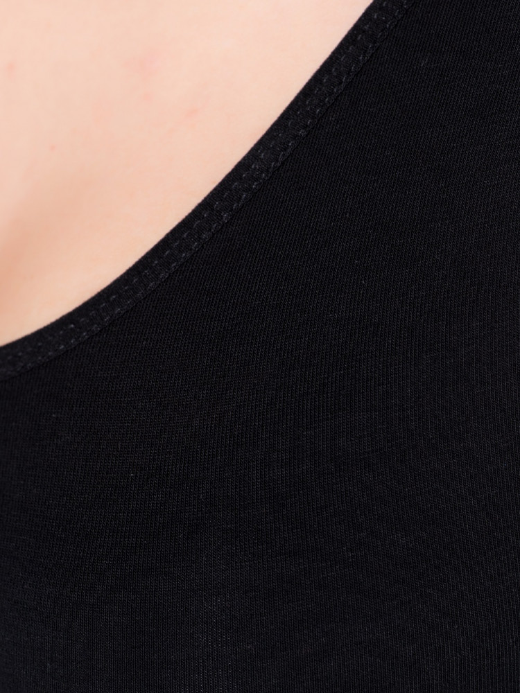 Качество товара хорошее, ткань понравилась - эластичная, растягивается. Размер хорошо сидит на фигуре. Приятно, что у черной майки вырез больше и на груди, и в пройме.