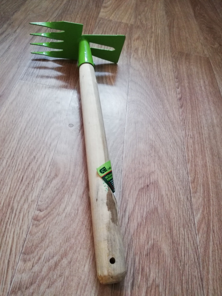 Хорошая мотыжка, толстоватая ручка, но, я думаю, такая надёжнее. Ширина там где зубья примерно 7 см, где лезвие - 6 см. Кстати, лезвие мотыги с прорезью.