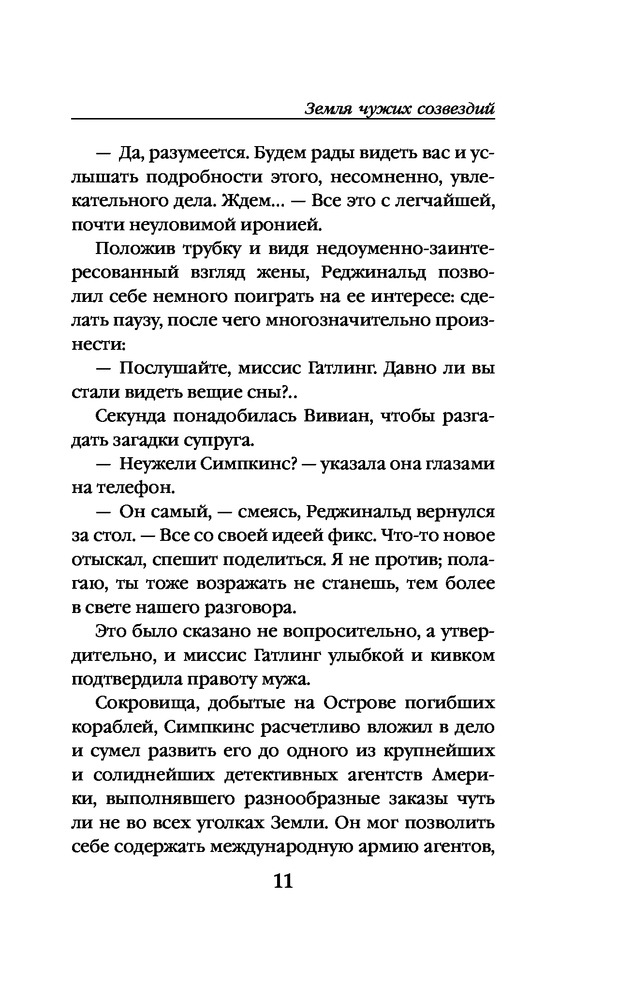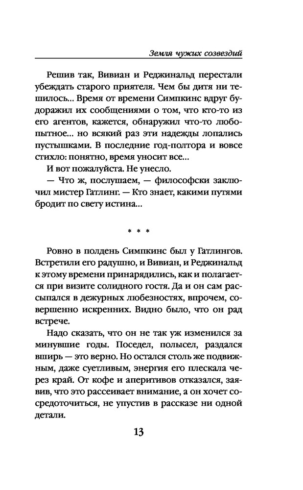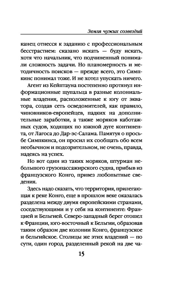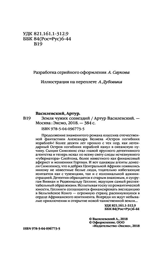 Земля чужих созвездийВ данный момент этот товар отсутствует в продаже. Возможно, у нас найдется аналогичный или похожий товар здесь. Серия: Мир Александра Беляева Продолжение знаменитого романа классика отечественной фантастики Александра Беляева «Остров погибших кораблей»! Более десяти лет прошло с тех пор, как легендарный Остров погибших кораблей канул в океанской пучине. Сыщик Симпкинс стал главой крупного детективного агентства, и теперь искал по всему свету следы исчезнувшего «губернатора» Слейтона, более известного, как финансовый аферист и мошенник Гортван. И вот однажды агенты донесли Симпкинсу, что в дебрях центральной Африки появились никому не известные белые люди, тщательно избегающие контактов как с туземцами, так и с колониальной администрацией. Детектив обращается к старым знакомым, к супругам Вивиан и Реджинальд Гатлинг, ведущим самый респектабельный образ жизни. Испытывая тоску по романтической юности, Гатлинги соглашаются финансировать экспедицию в Бельгийское Конго — огромную страну, раскинувшуюся в сердце африканского континента. Впереди их ждут небывалые приключения и открытие новой таинственной земли... |