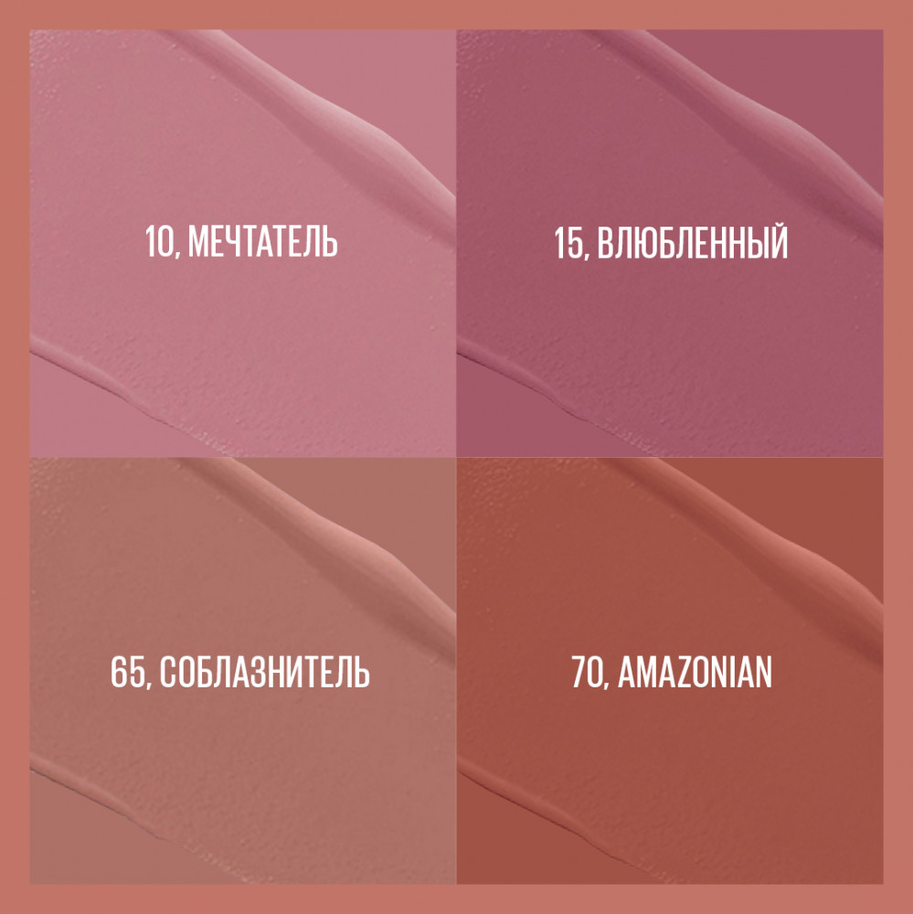 Эта помада находка для меня. То что искала всю жизнь. Матовая. На губах не ощущается и не стирается весь день! Но есть свои правила нанесения: наносим аккуратно, тонким слоем, лишнее промакиваем салфеткой. Только в этом случае будет лёгкость и стойкость. Минус в том что, цвета не соответствуют фактическому, здесь надо знать какой брать. 65 - спокойный, хороший цвет, ближе к натуральному. 15 - нежный сиреневый поярче но не кричащий. Этими цветами пользуются в основном.