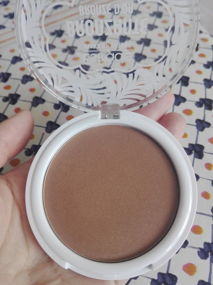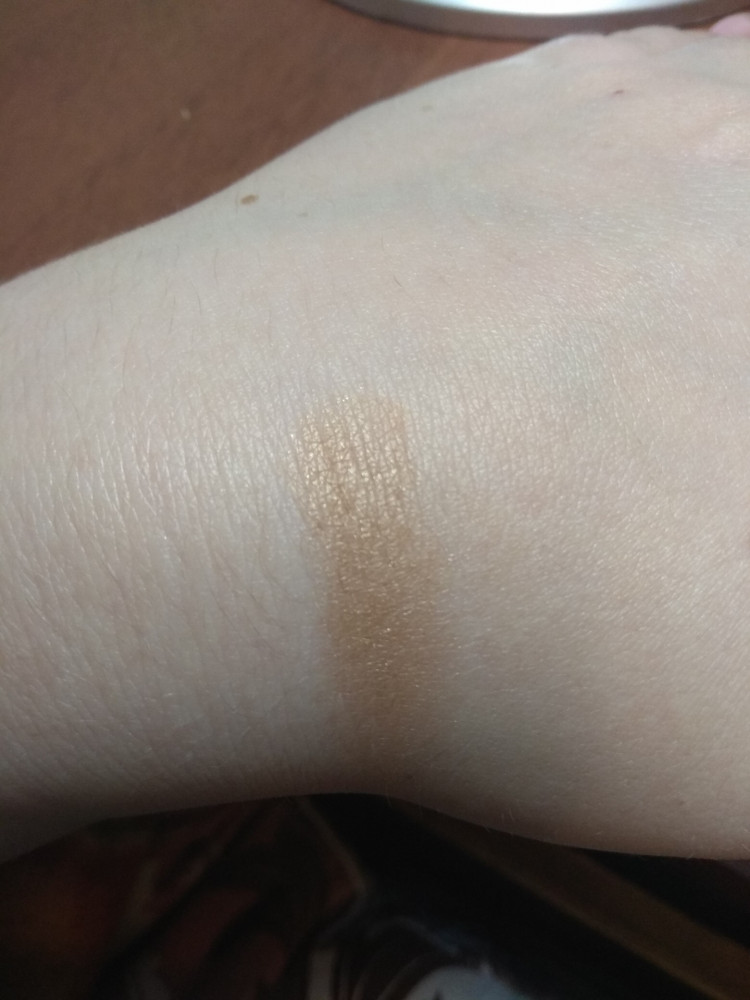 Неплохой продукт. Приятная мелкая текстура, есть отдельные блестки, если "перебощить" будет золотой перламутр. Лучше всего подойдёт теплым (желтым) оттенкам кожи. На фото жирненький слой. Хорошо то, что его можно растушевать, и растушевка мягкая.