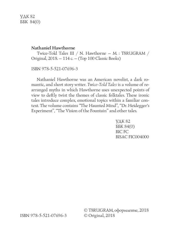 💳 Оплатить за товар можно при получении 🇰🇿 Есть бесплатная доставка по Казахстану от 1 дня 🎁 Копите бонусы с каждой покупки Серия: Top100 Classic Books Nathaniel Hawthorne was an American novelist, a dark romantic, and short story writer. Twice-Told Tales is a volume of rearranged myths in which Hawthorne uses unexpected points of view to deftly twist the themes of classic folktales. These ironic tales introduce complex, emotional topics within a familiar context. The volume contains «The Haunted Mind», «Dr. Heidegger’s Experiment», «The Vision of the Fountain» and other tales. |