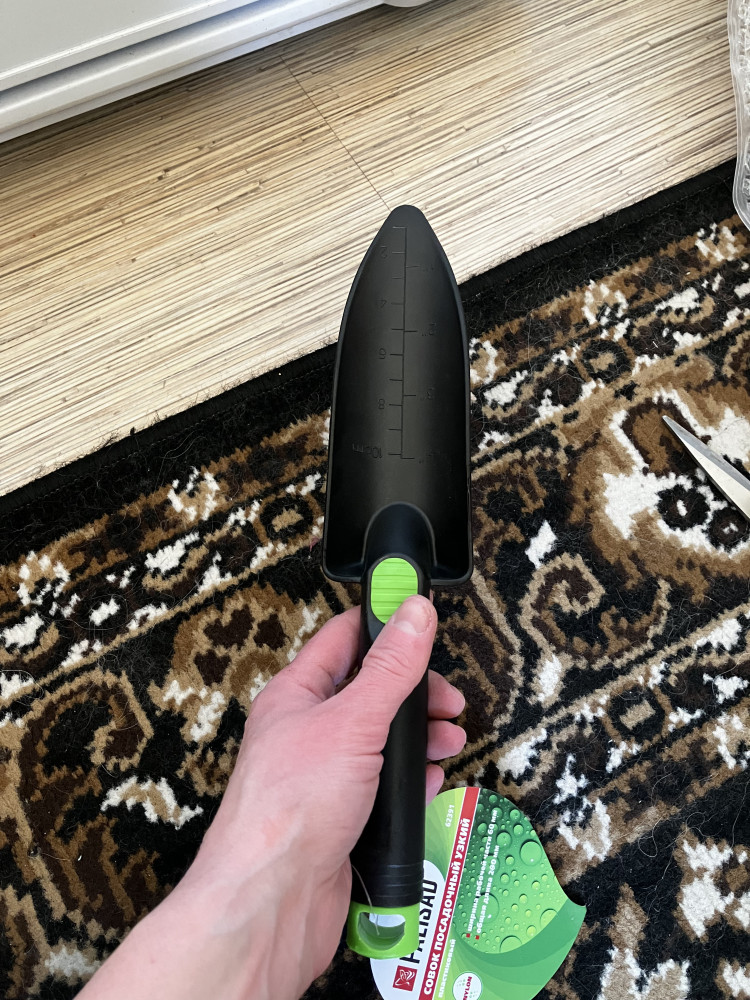 Совок крепкий , узкий- как раз для лунок на посадку. удобный для руки. даже в см можно смотреть на сколько лунку выкопали.