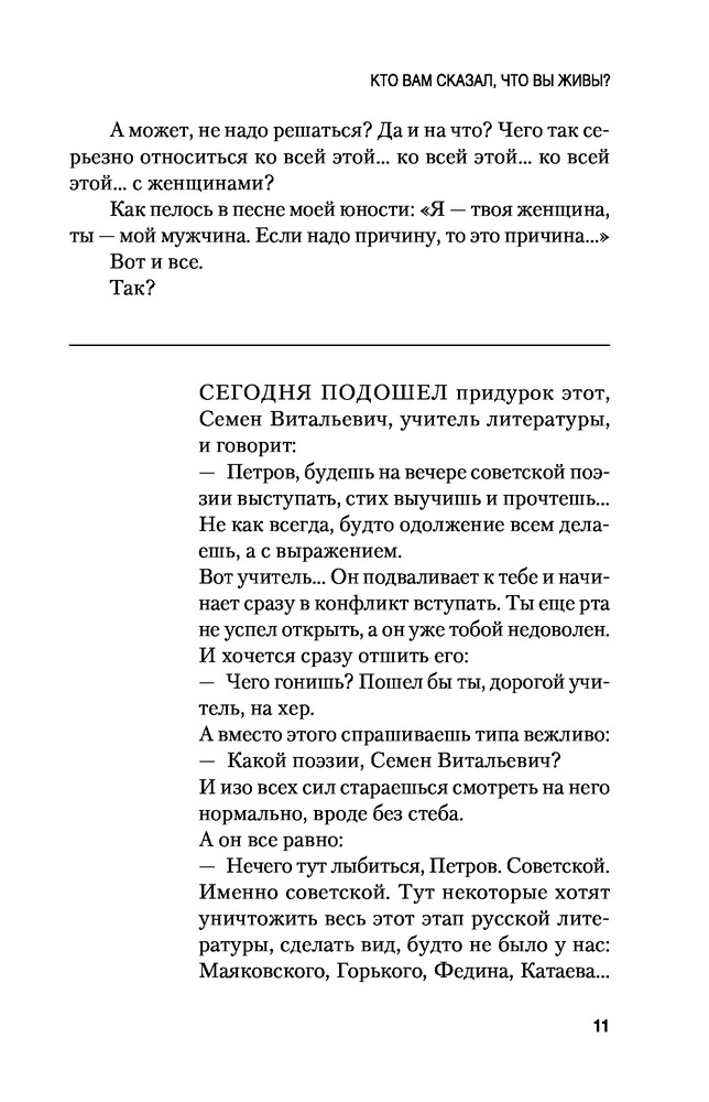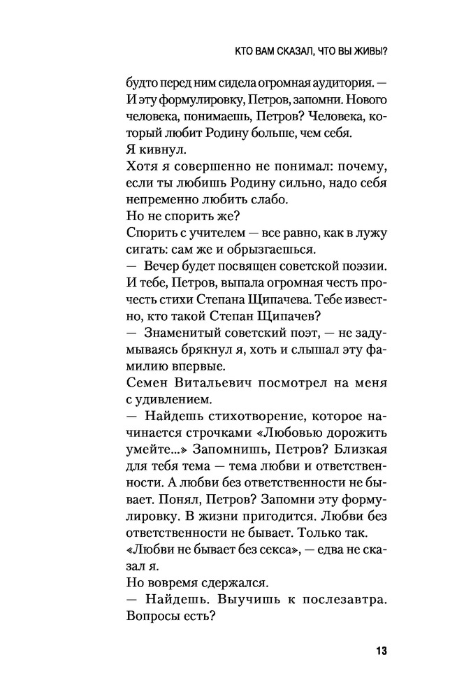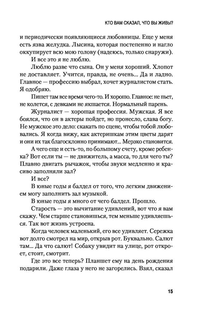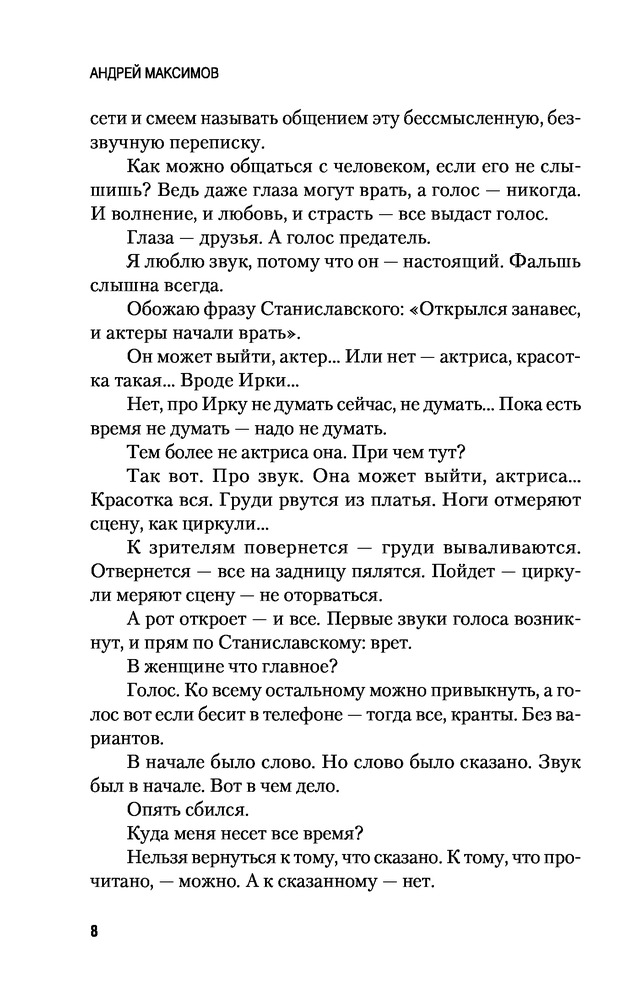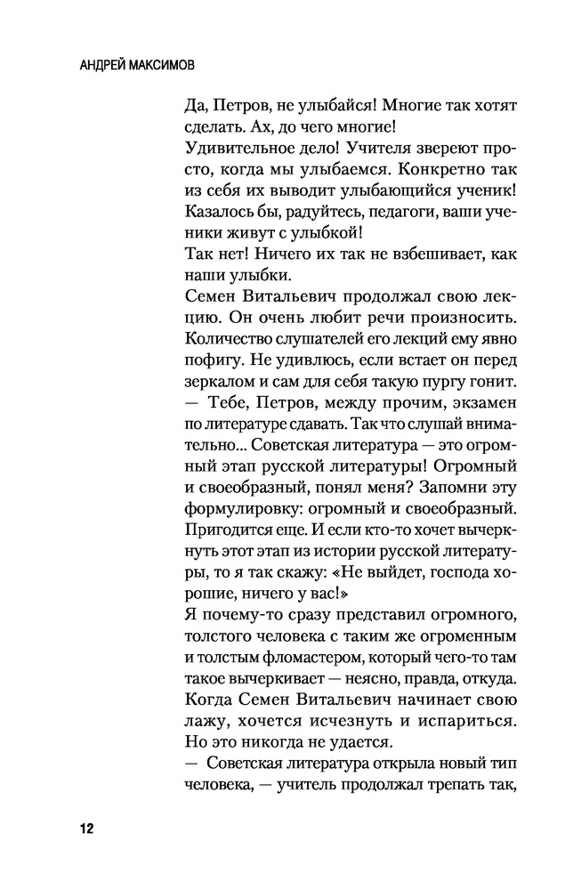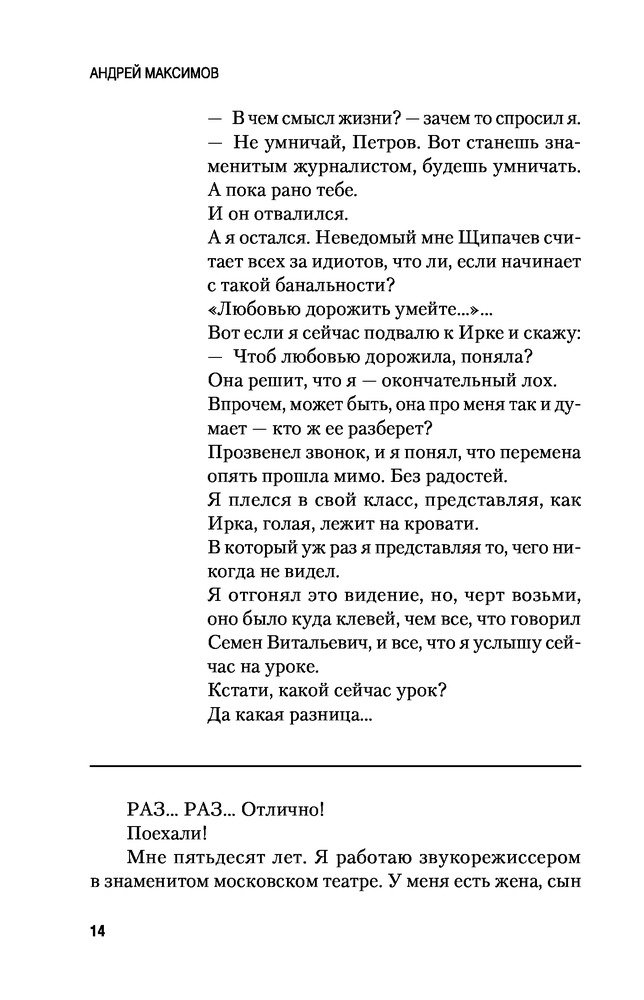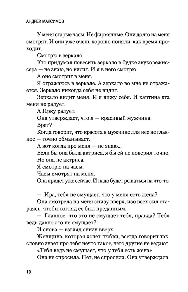 Серия: Проза Андрея Максимова Любовь. Секс. Самоубийство, которого не было. Труп, принадлежащий другому. Тишина заменит жизнь отцу. Суета заменит жизнь сыну. Они расстанутся, не замечая друг друга. И встретятся, когда сын придет к отцу после собственной смерти. Новый роман Андрея Максимова абсолютно необычен. Он заставит Вас плакать, смеяться, а главное, думать. Этот роман не надо пересказывать. Его надо читать. Андрей Максимов — известный журналист, писатель, радио- и телеведущий, театральный режиссер. Колумнист «Российской газеты». Автор бестселлеров «Психофилософия», «Как не стать врагом своему ребенку», «Психофилософия 2.0» и др. |