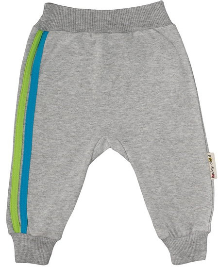 Хорошие штанишки серого цвета. Яркие лампасы делают их эффектными, уникальными. Материал очень приятный, 100% хлопок. Пояс широкий, на живот не давит. Есть манжеты на ножках.