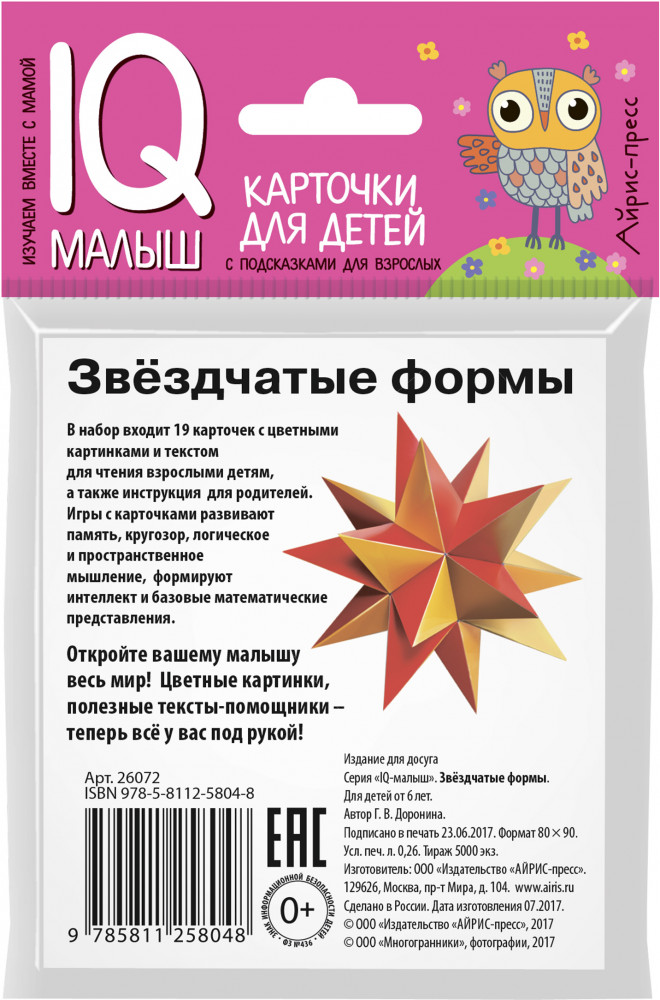 💳 Оплатить за товар можно при получении 🇰🇿 Есть бесплатная доставка по Казахстану от 1 дня 🎁 Копите бонусы с каждой покупки Серия: IQ малыш Игры с карточками не просто знакомят малыша с нашим удивительным миром, они развивают память, зрительное и слуховое восприятие, расширяют словарный запас, формируют интеллект. С помощью этого набора двусторонних карточек ребёнок познакомится со звёздчатыми многогранниками и откроет для себя увлекательный мир геометрии. В комплект входит 19 карточек с цветными картинками и текстом-подсказкой на обороте для чтения взрослыми детям, а также карточка с инструкцией для родителей. |