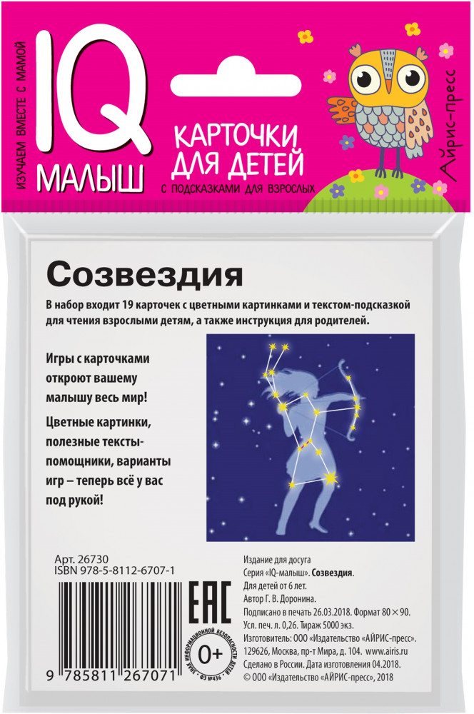 💳 Оплатить за товар можно при получении 🇰🇿 Есть бесплатная доставка по Казахстану от 1 дня 🎁 Копите бонусы с каждой покупки Серия: IQ малыш Игры с карточками не просто знакомят малыша с нашим удивительным миром, они развивают память, зрительное и слуховое восприятие, расширяют словарный запас, формируют интеллект. Этот набор карточек познакомит с различными созвездиями, видимыми на нашем небе. Откройте Вашему ребёнку увлекательный мир астрономии! Игры с карточками помогут развить память, зрительное и слуховое восприятие, расширить словарный запас и сформировать интеллект. |