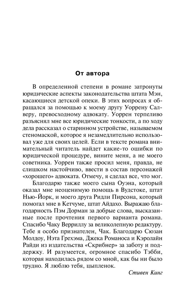 Разочарована, ничего шедеврального не нашла! Книгу для себя разделила на три части. Первую часть пока читала, не могла долго понять это уже сама книга или мемуары самого Кинга. Во второй части конечно уже в тему вошла, но конкретно заскучала и начало приходить разочарование. Ну и третья часть, ужастик есть, но он на уровне писателя дебютанта, который вчера только первый раз сел за написание романа и думает, что из под пера выйдет шедевр. Вот реально, не советую!