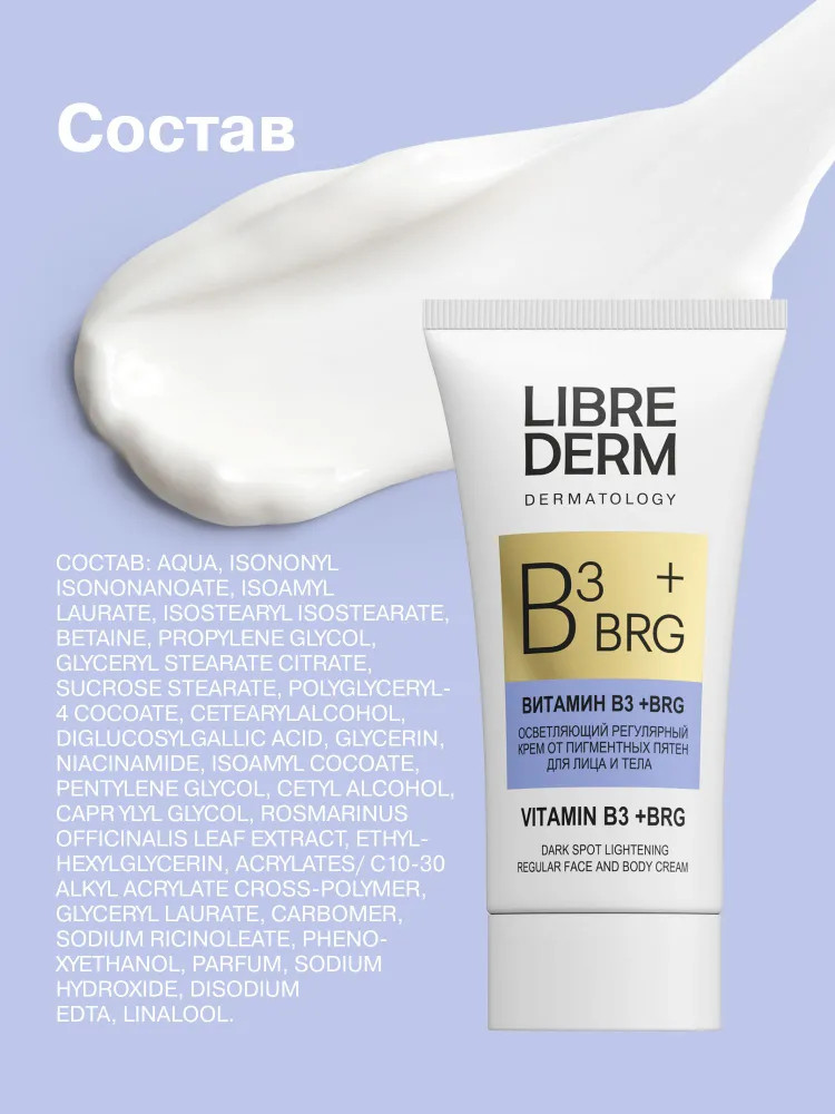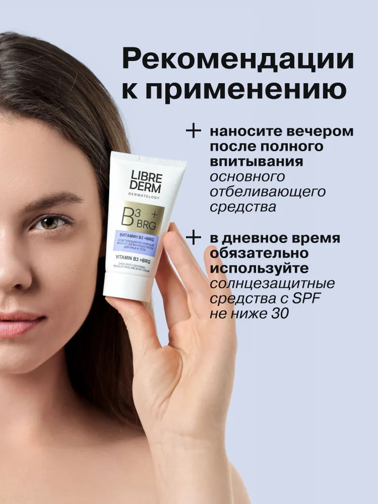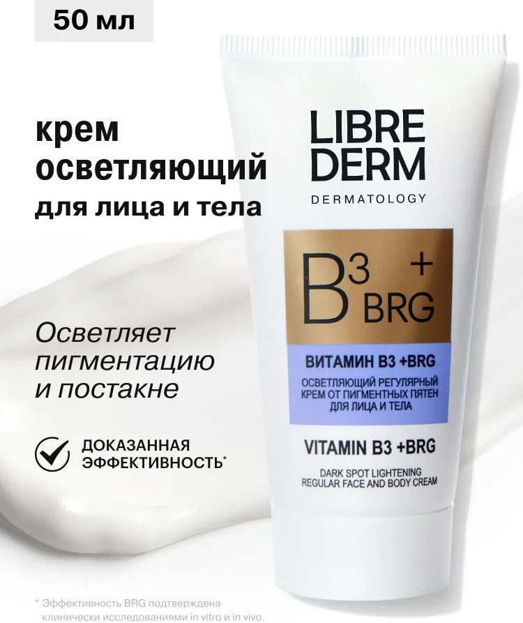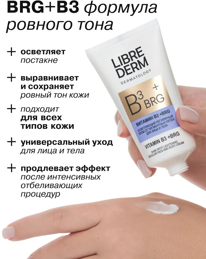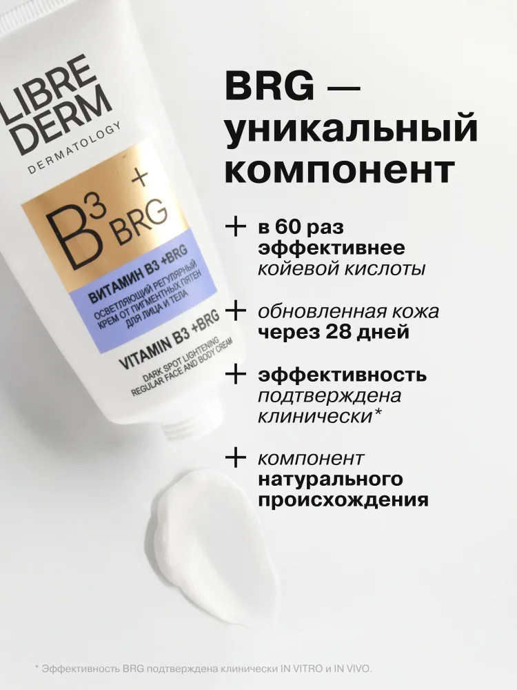 Крем для лица и тела BRG +витамин В3 Librederm® помогает поддерживать и продлевать эффект осветления пигментных пятен после интенсивных процедур устранения пигментных пятен. Крем позволяет контролировать воспалительные процессы, уменьшая покраснения, защищает клеточную ДНК от УФ-излучений, оказывает антиоксидантную защиту клеток. Благодаря биоактиву в составе сыворотки содержание меланина в области гиперпигментации сокращается на 31%, выравнивается тон кожи.