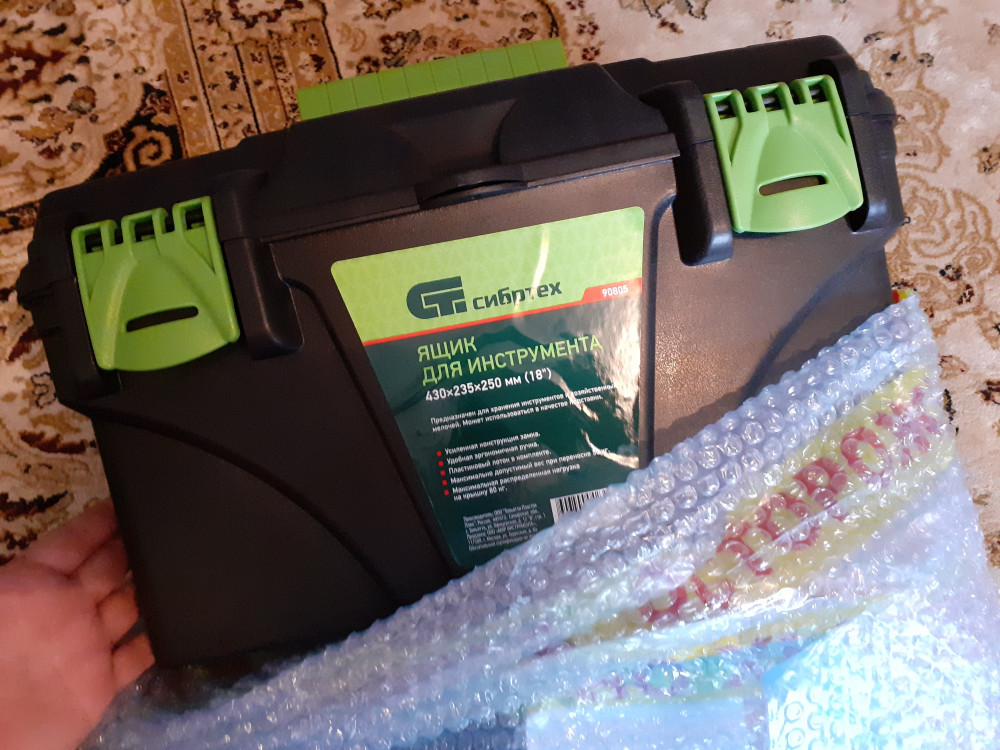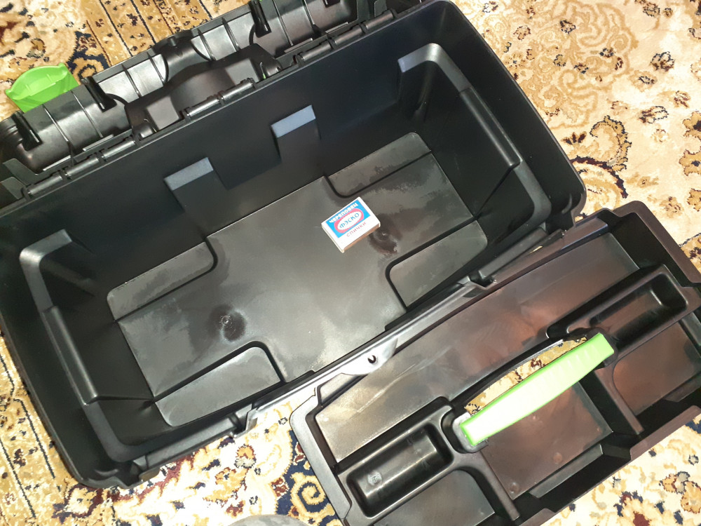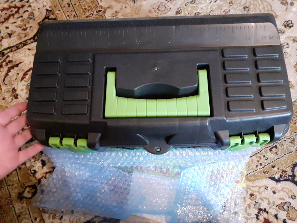 Ящик вполне хороший для хранения инструмента. Незначительная проблема с защелками, которые западают внутрь ящика при закрытии крышки.