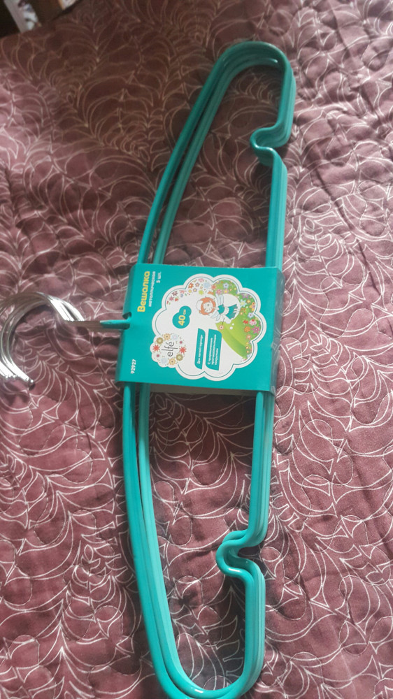 Плечики тонкие металлические, полностью покрытые силиконом (красивого бирюзового цвета двух разных оттенков), за счёт чего одежда на них вообще не скользит. Крючок не поворотный, металл очень жёсткий, не прогибается, за счёт этого выдерживают и объемные вещи. Размер одежды, который будет на них хорошо размещаться приблизительно до 48-50.